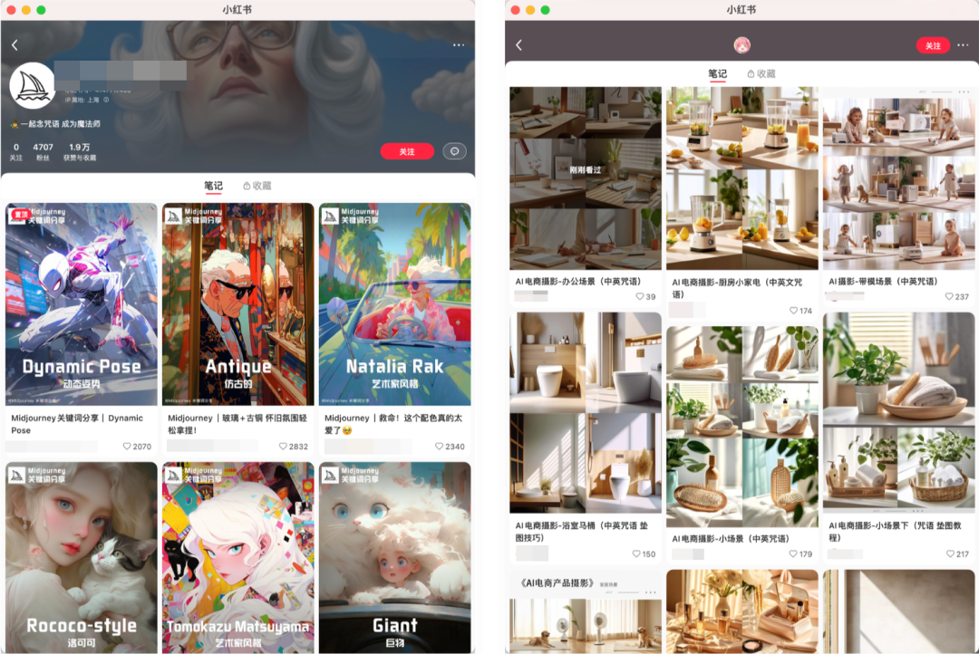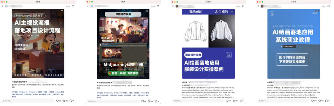其实也就是如何去设置你的账号主页、昵称、简介这些,让别人看到你的主页/笔记就知道你是干什么的,切记做号前先确定自己的诉求是做AI绘画博主、还是做商业变现,在或者是做工具号纯引流?以终为始去做包装和人设,内容越垂直吸引人群越精准,人群质量就越高。这里也给大家列举几个模版,头像背景图这些可以之间拿去用,名字、简介稍微调整可之间用,作品封面可根据选题进行修改,排版可模仿。