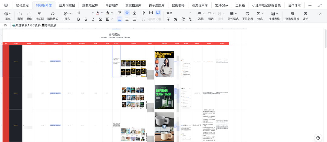 比如当时我做AI绘画项目图文号时,是根据项目选题、内容展示方式、钩子种类等几个确定的维度进行拆解,你也可以弄一个对标表格出来。