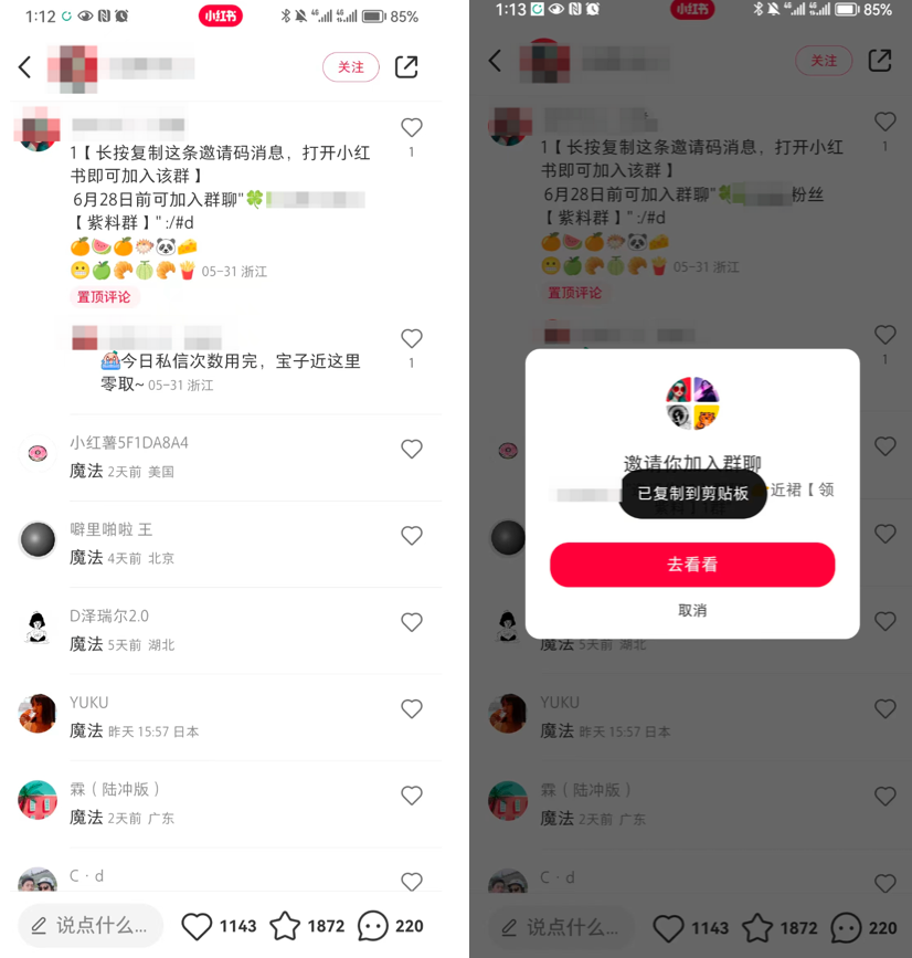 (3)在笔记的评论区发布加入小红书群聊的邀请码链接,用户复制后就可以点击加入群聊。