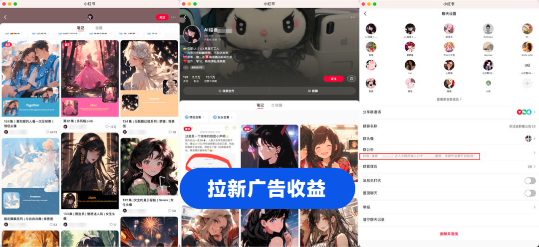 小红书群:在多个不同的群里,群发相同的内容。