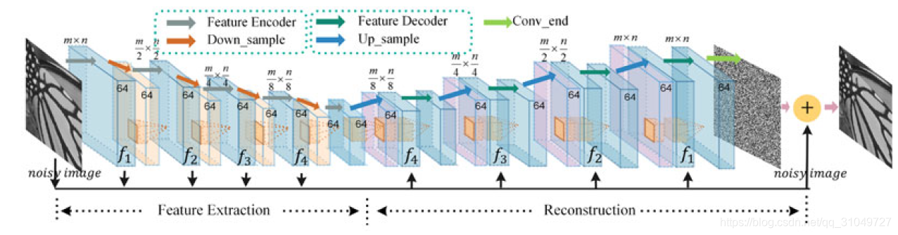 进一步,每个阶段中间的DCNN denoiser,主要采用的是类似于Unet的encoder-decoder结构,如下图所示,通过上下采样得到不同尺度的信息,也同时获取更大的感受野。在网络中还增加了一个long-term skip connection,用于线性映射让网络学习到图像中的噪声。同时,为了将降采样和上采样过程中丢失掉的信息找回来,仿照unet一样中间加了对应网络层的skip用于融合该分辨率的原始信号。