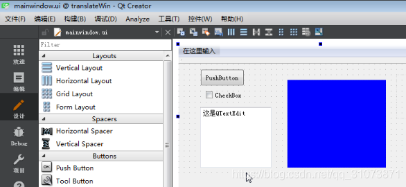 直接在UI的主窗口中,拖出几个控件,下图我放置了一个QPushButton按钮、QCheckBox复选框、设置了蓝色背景的QWidget。
