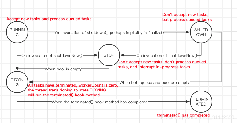 TIDYING: All tasks have terminated, workerCount is zero, the thread transitioning to state TIDYING will run the terminated() hook method