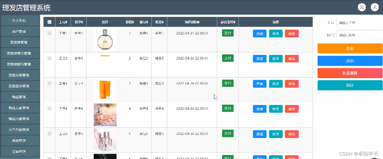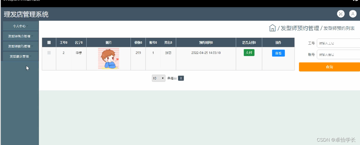 本次设计任务是要设计一个理发店管理系统,通过这个系统能够满足理发店管理功能。系统的主要功能包括:个人中心,用户管理,发型师管理,发型师简介管理,发型师预约管理,发型分类管理,发型展示管理,物品管理,物品入库管理,物品出库管理,公告信息管理,系统管理,订单管理等。