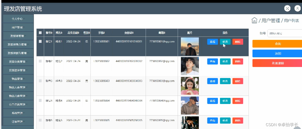 本系统提供给管理员对个人中心,用户管理,发型师管理,发型师简介管理,发型师预约管理,发型分类管理,发型展示管理,物品管理,物品入库管理,物品出库管理,公告信息管理,系统管理,订单管理等诸多功能进行管理。本系统对于用户输入的任何信息都进行了一定的验证,为管理员操作提高了效率,也使其数据安全性得到了保障。