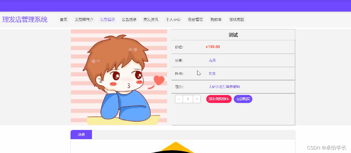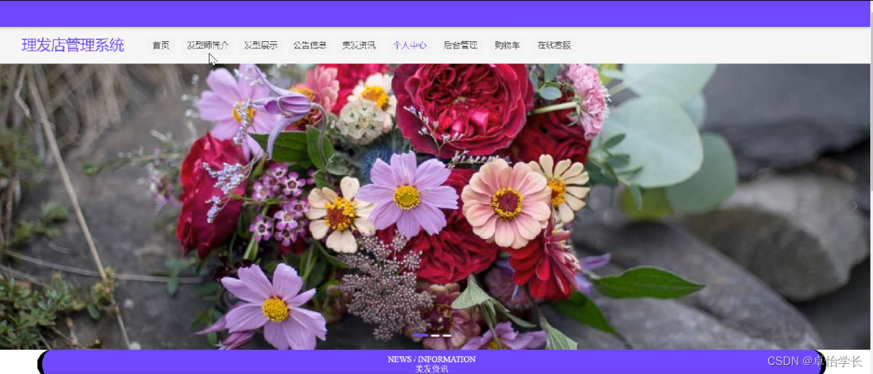 前台功能:用户进入系统可以对首页,发型师简介,发型展示,公告信息,美发资讯,个人中心,后台管理,购物车,在线客服等功能进行操作。