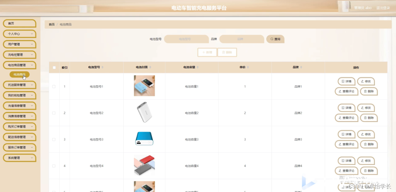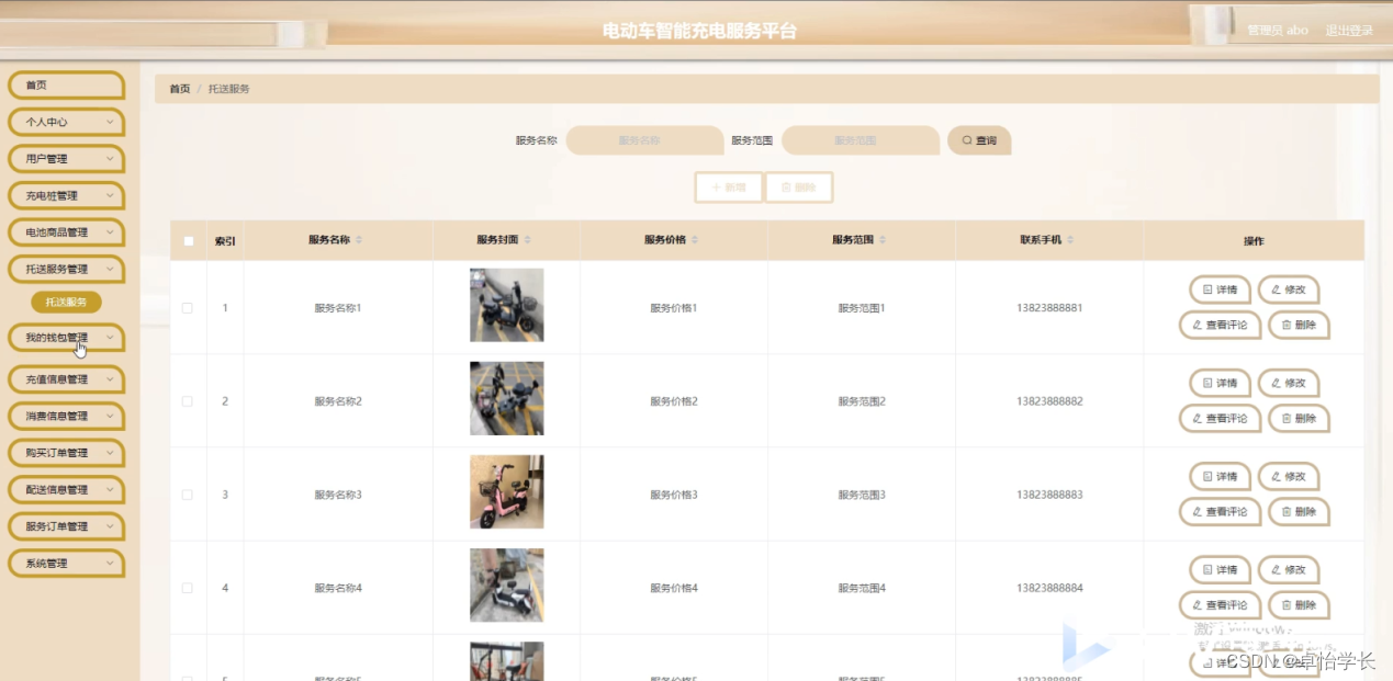 本次设计任务是要设计一个电动车智能充电服务平台,通过这个系统能够满足电动车智能充电服务的管理及用户的电动车智能充电服务分享功能。系统的主要功能包括:首页、个人中心、用户管理、充电桩管理、电池商品管理、托送服务管理、我的钱包管理、充值信息管理、消费信息管理、购买订单管理、配送信息管理、服务订单管理、系统管理等功能。