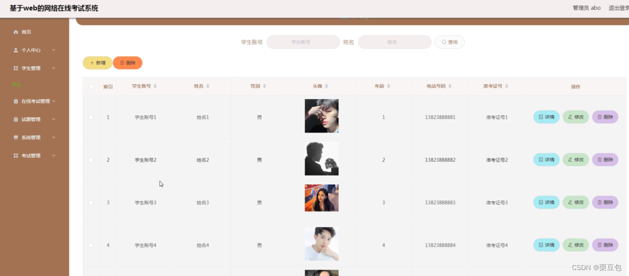 本系统的用户可分为学生和管理员两个用户角色组成。管理员可以管理系统内所有功能,主要有首页、个人中心、学生管理、在线考试管理、试题管理、系统管理、考试管理等功能;学生登录系统主要有首页、个人中心等功能。