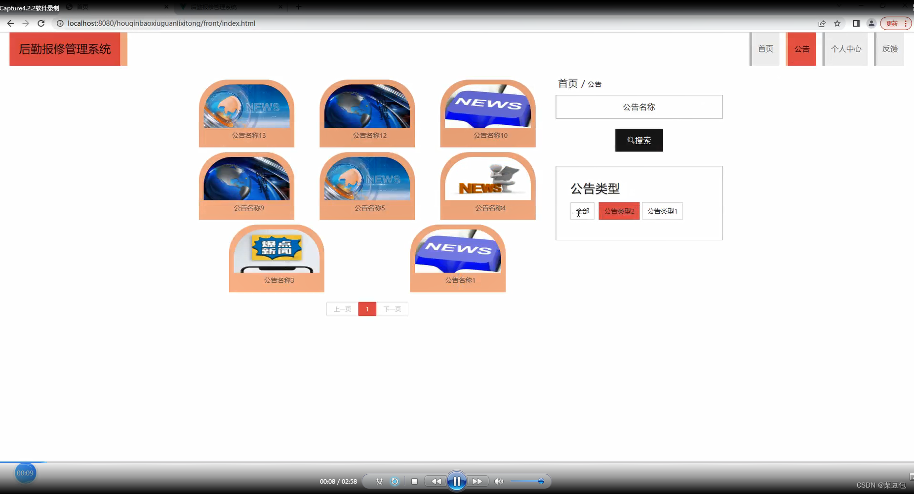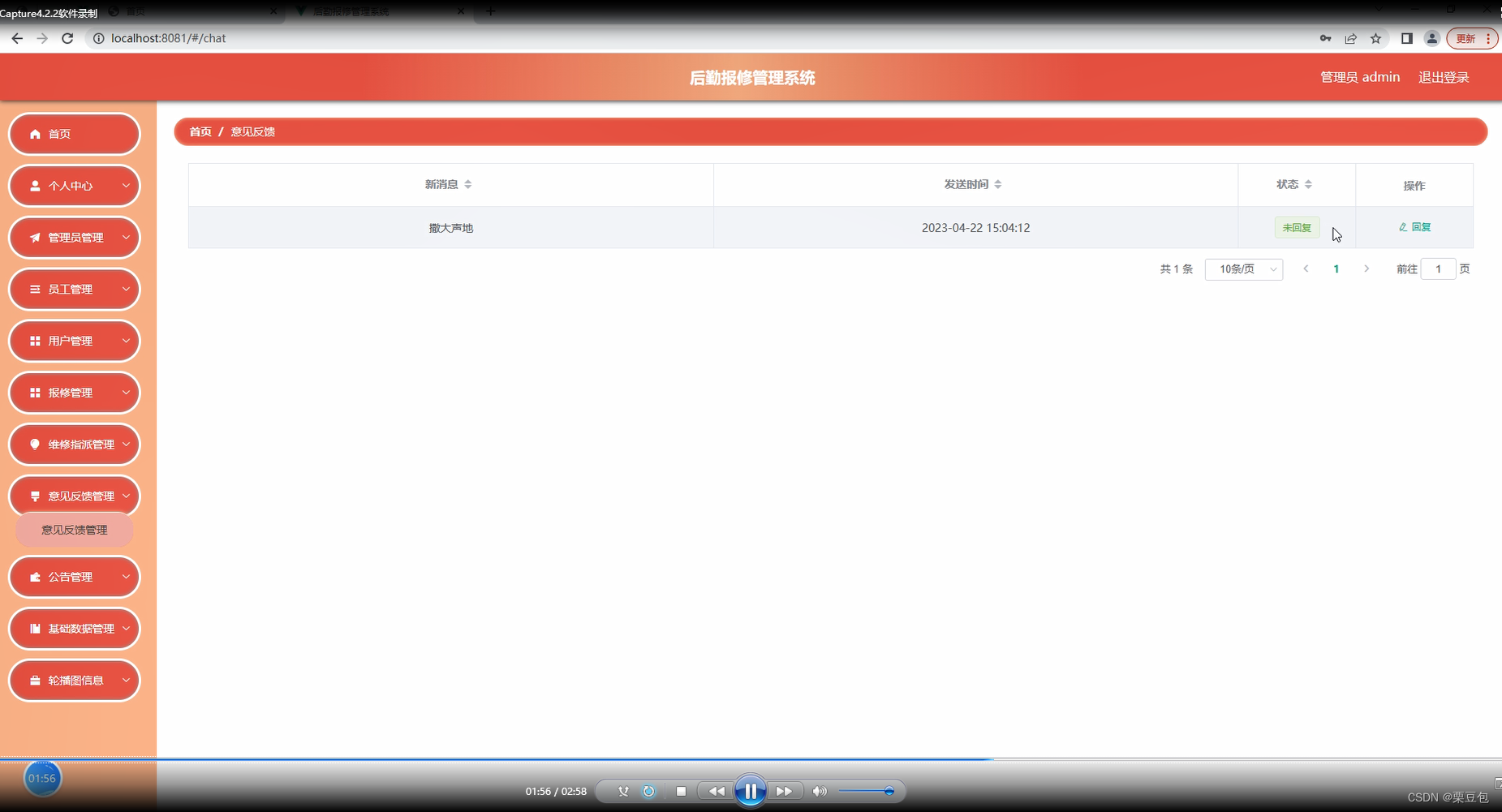 后勤报修管理系统管理系统按照操作主体分为管理员和用户。管理员的功能。用户的功能等。该系统采用了Mysql数据库,Java语言,Spring Boot框架等技术进行编程实现。