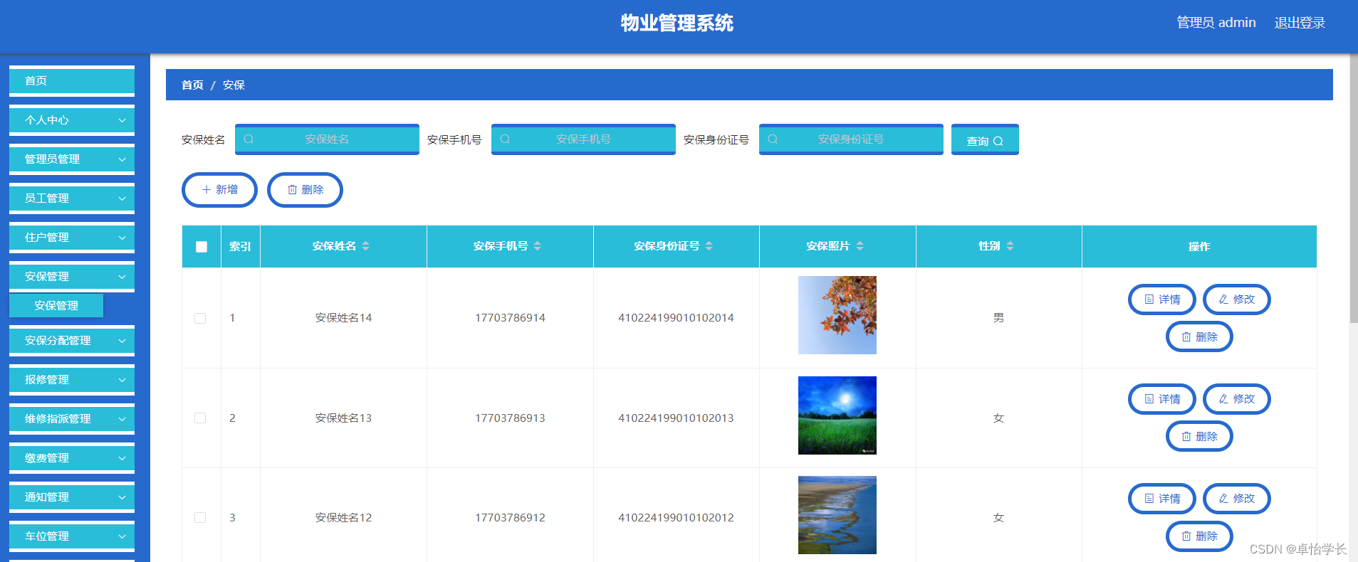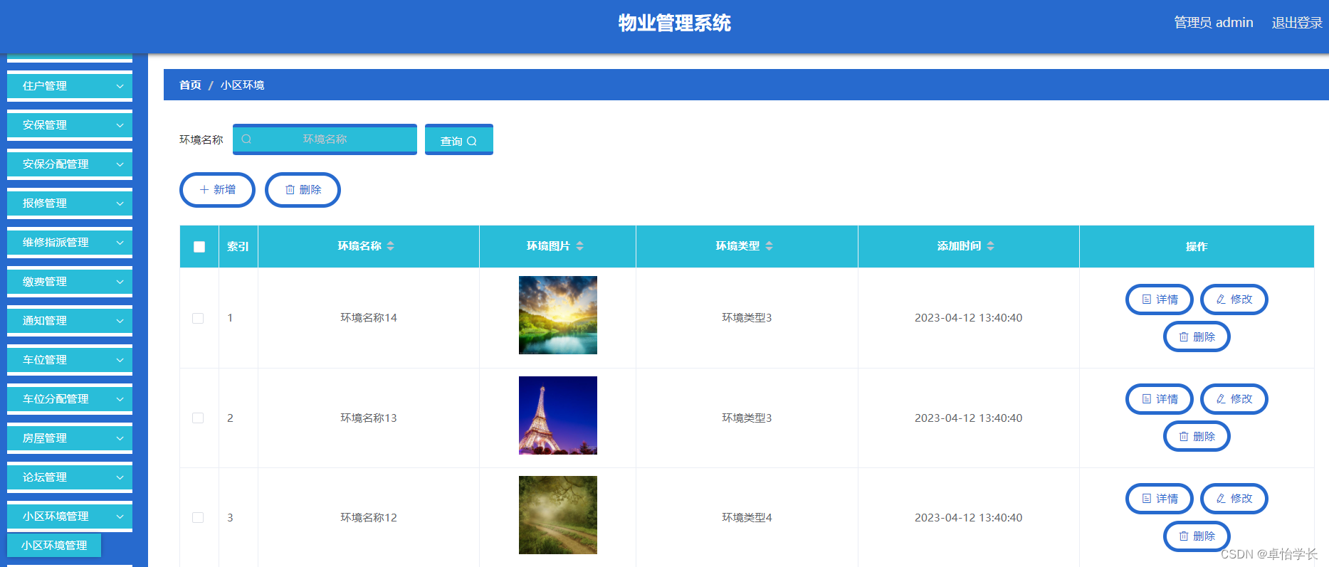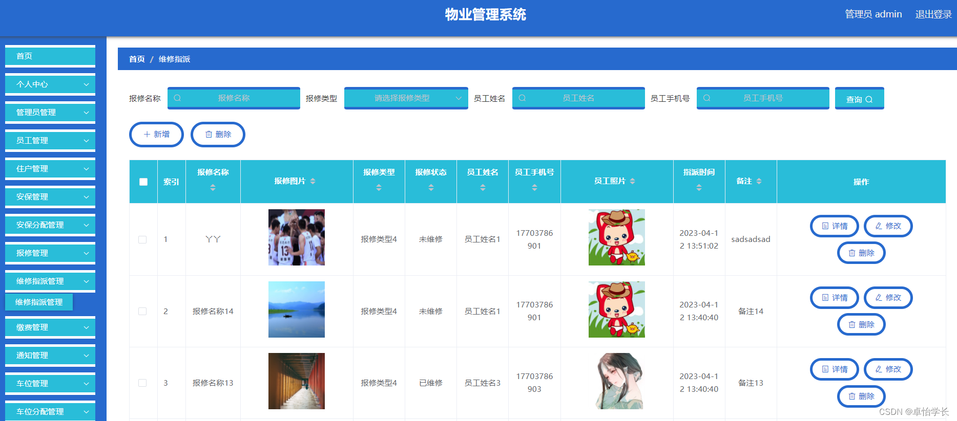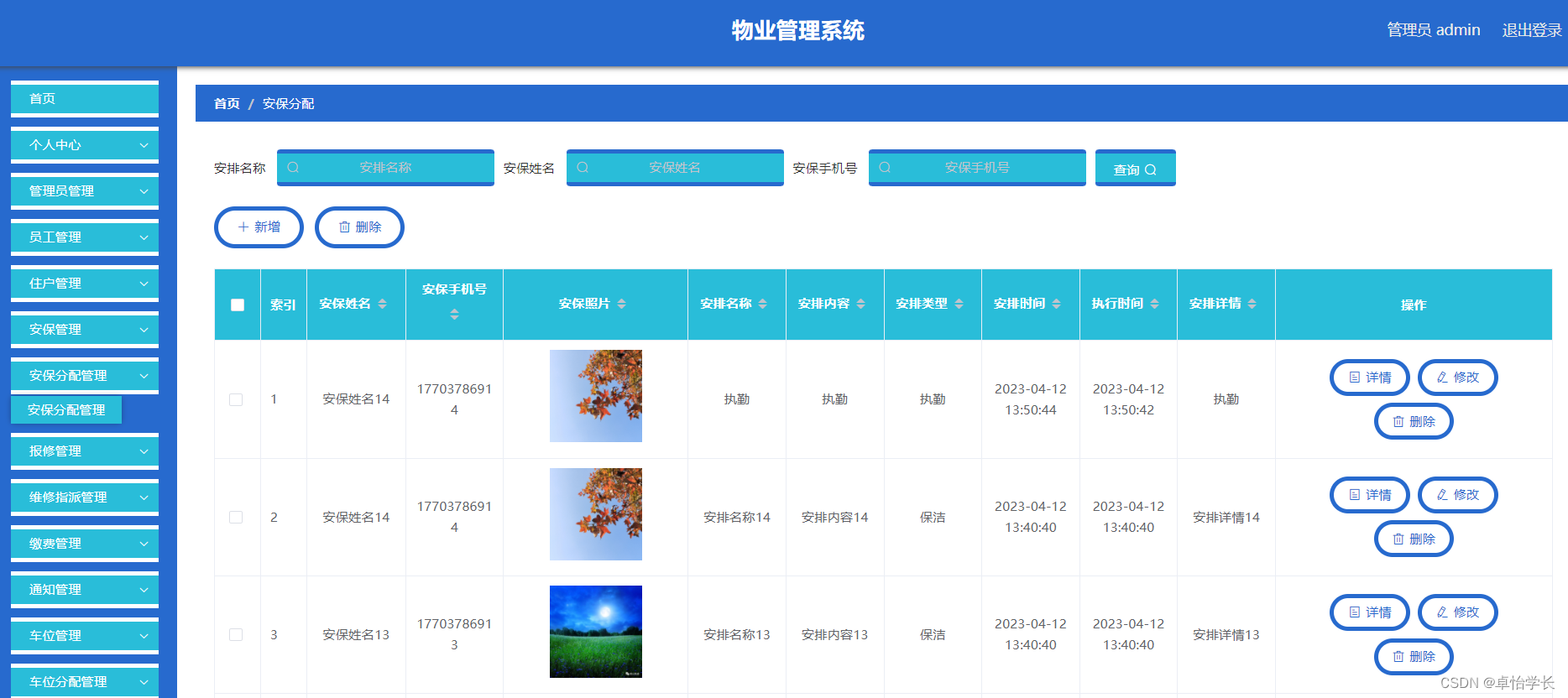 物业管理系统采用当前最流行的IDEA工具进行开发,使用Java语言,框架使用Spring Boot框架。系统能实现小区环境管理,维修指派管理,安保分配管理,车位分配管理,缴费管理,报修管理等功能。