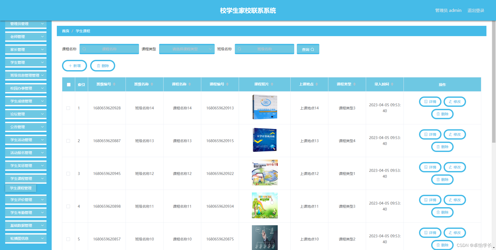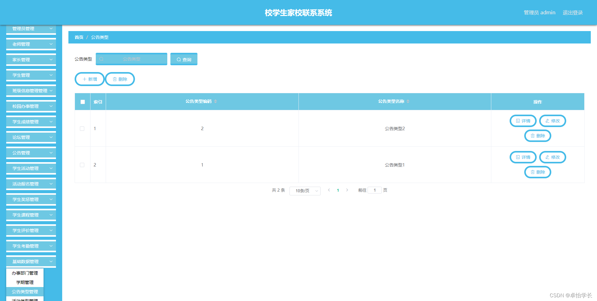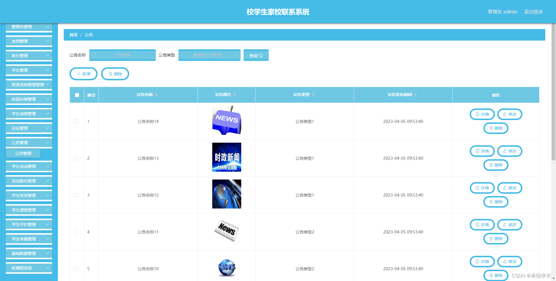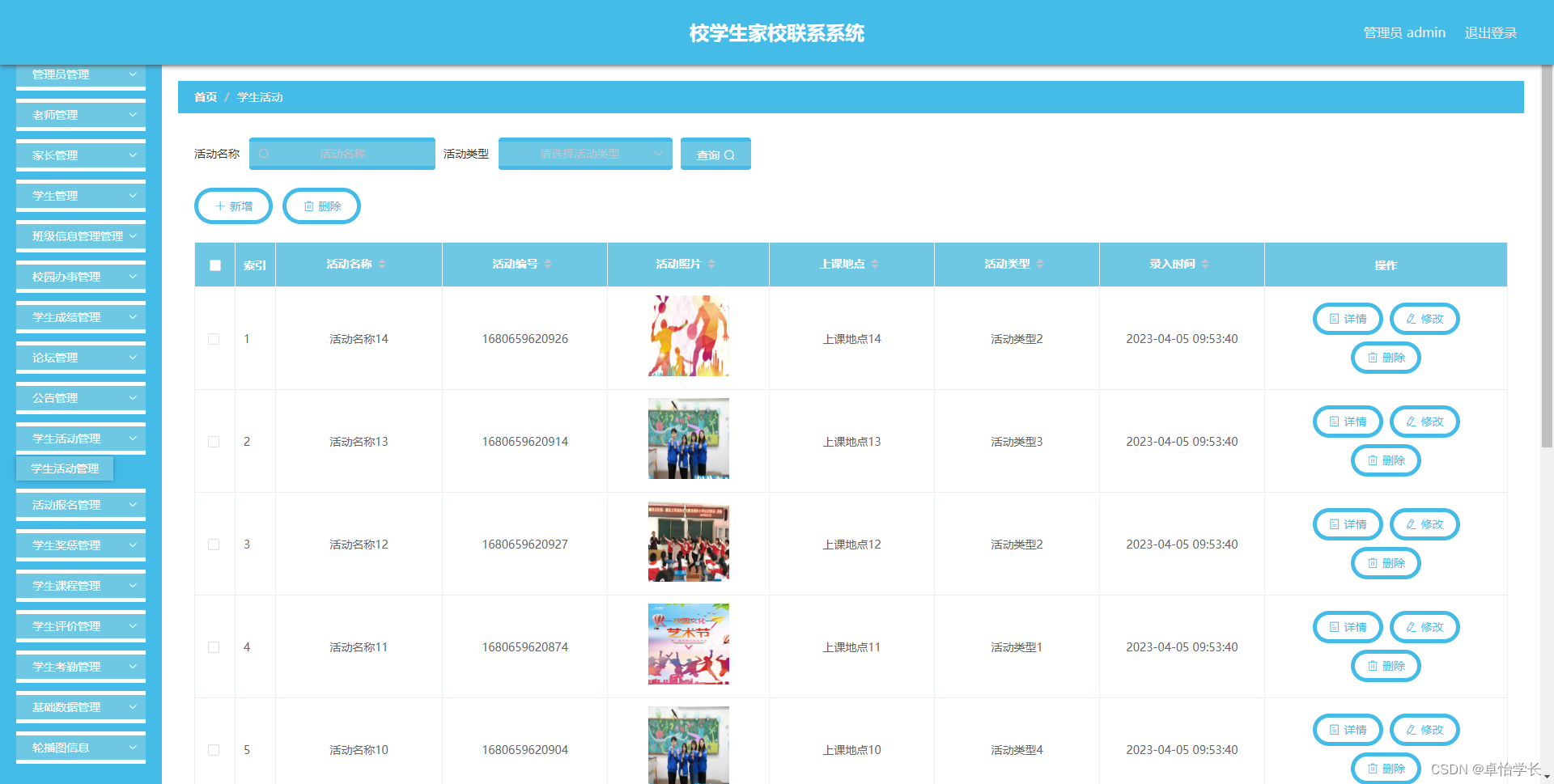 校学生家校联系系统管理系统按照操作主体分为管理员和用户。管理员的功能包括班级信息管理管理、校园办事管理、学生成绩管理、字典管理、论坛管理、公告管理、学生活动管理、活动报名管理、学生奖惩管理、家长管理、学生课程管理、老师管理、学生评价管理、学生管理、学生考勤管理、管理员管理。用户的功能等。该系统采用了Mysql数据库,Java语言,Spring Boot框架等技术进行编程实现。