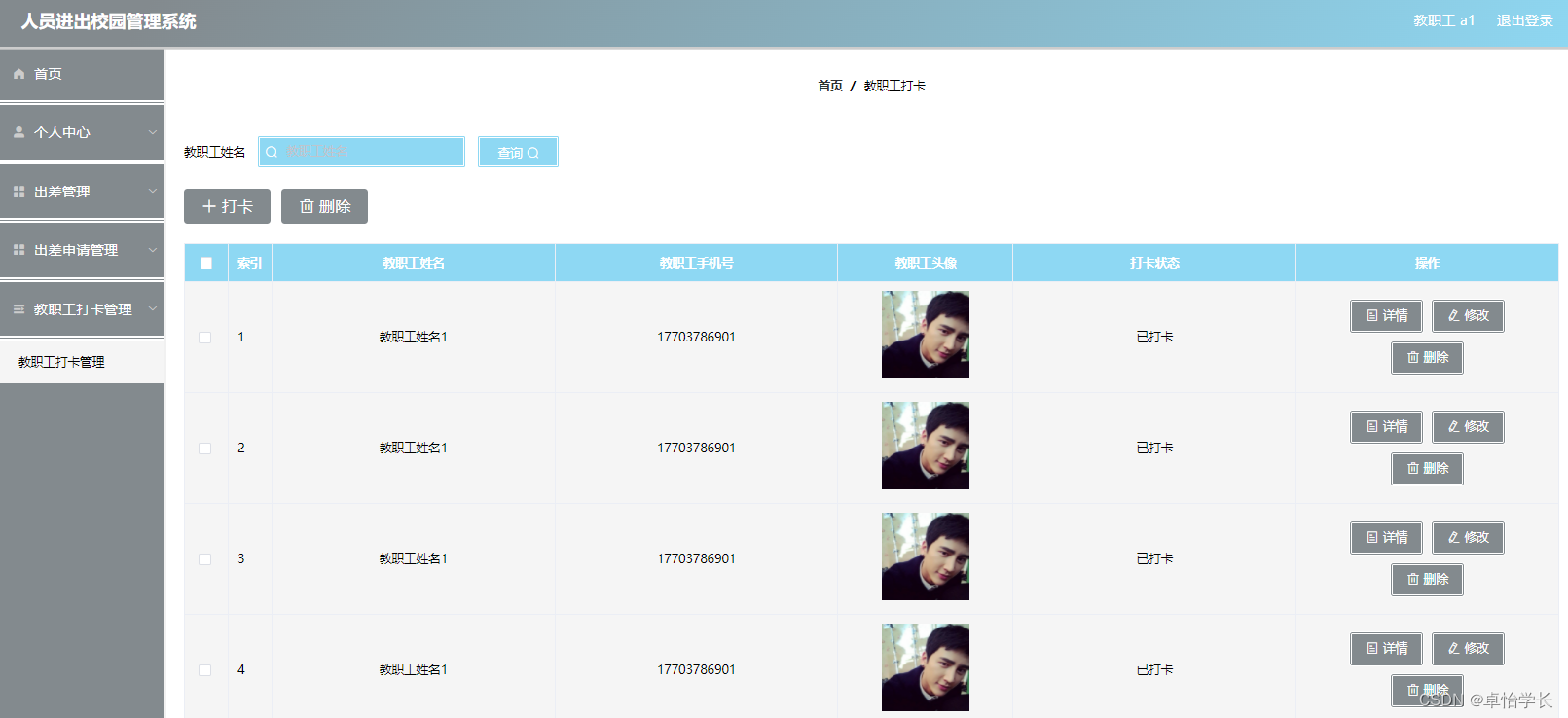 该系统使用Java语言和Spring Boot框架等技术实现编程,数据库使用到了MySQL数据库。系统的主要功能包括教职工打卡管理,出差管理,请假申请管理,入校申请管理,学生打卡管理,出差申请管理等功能。