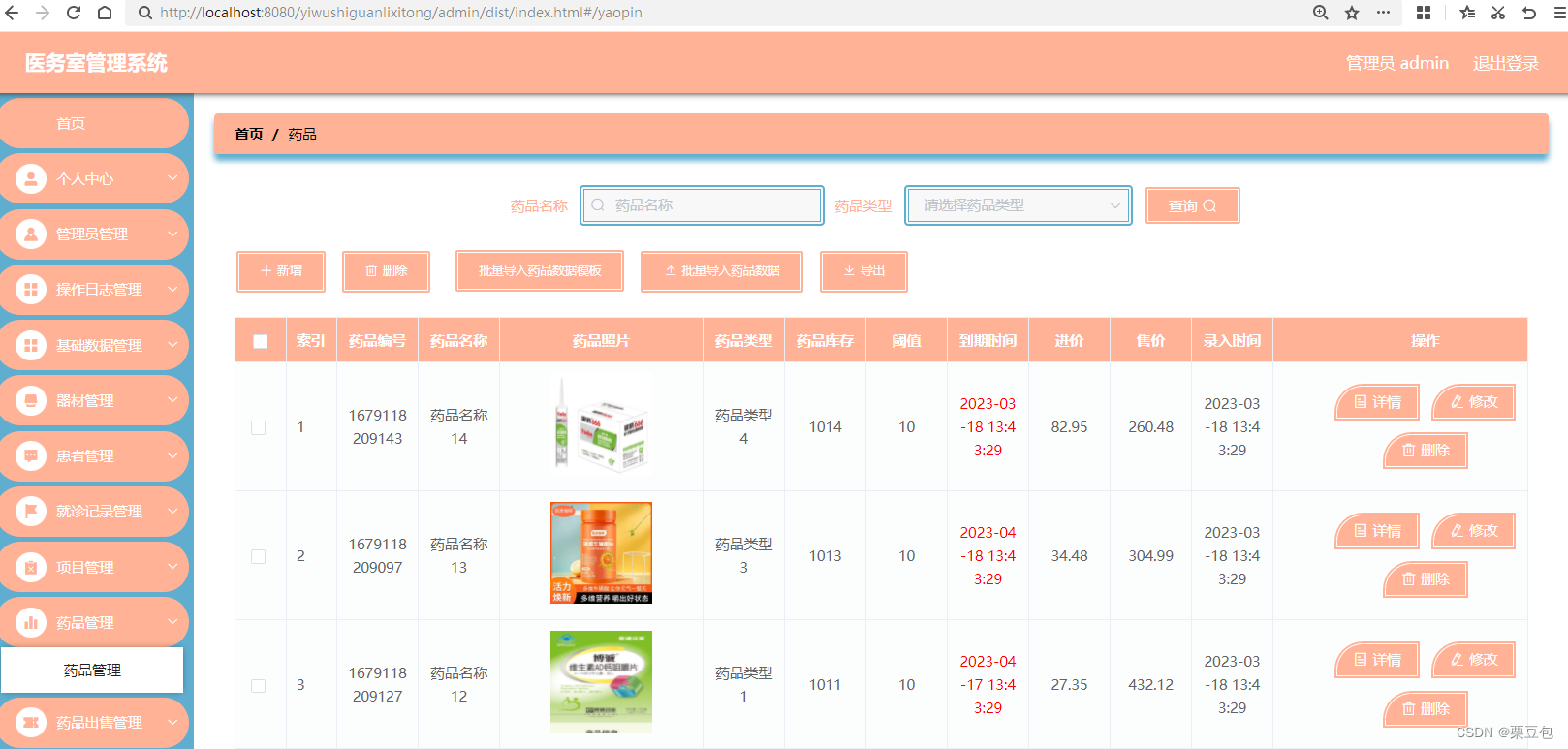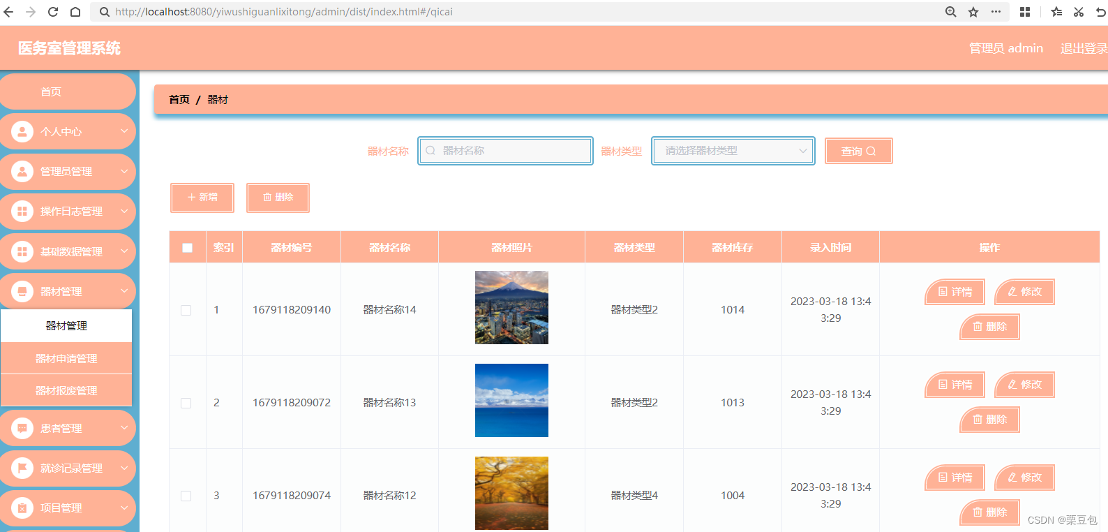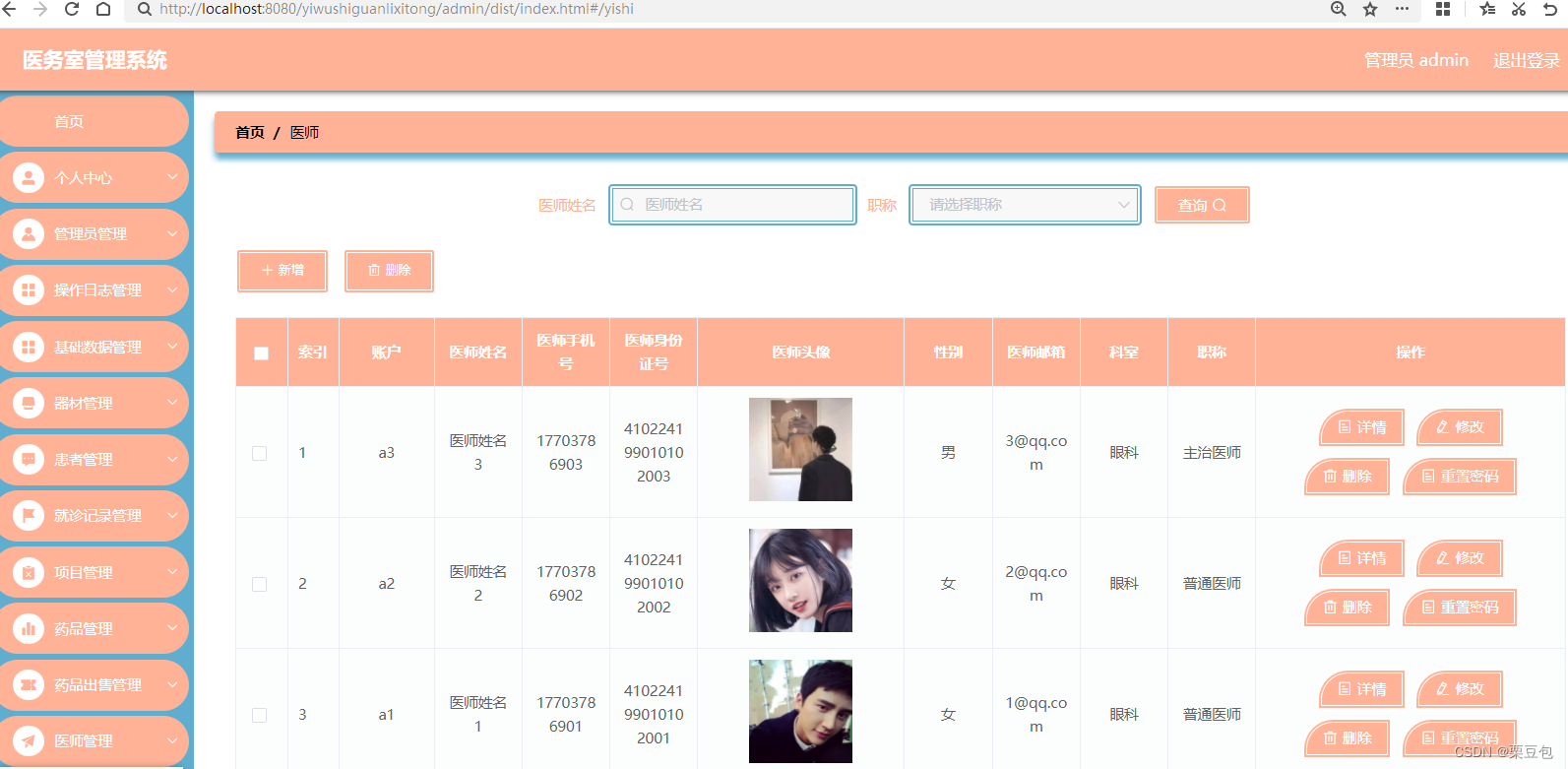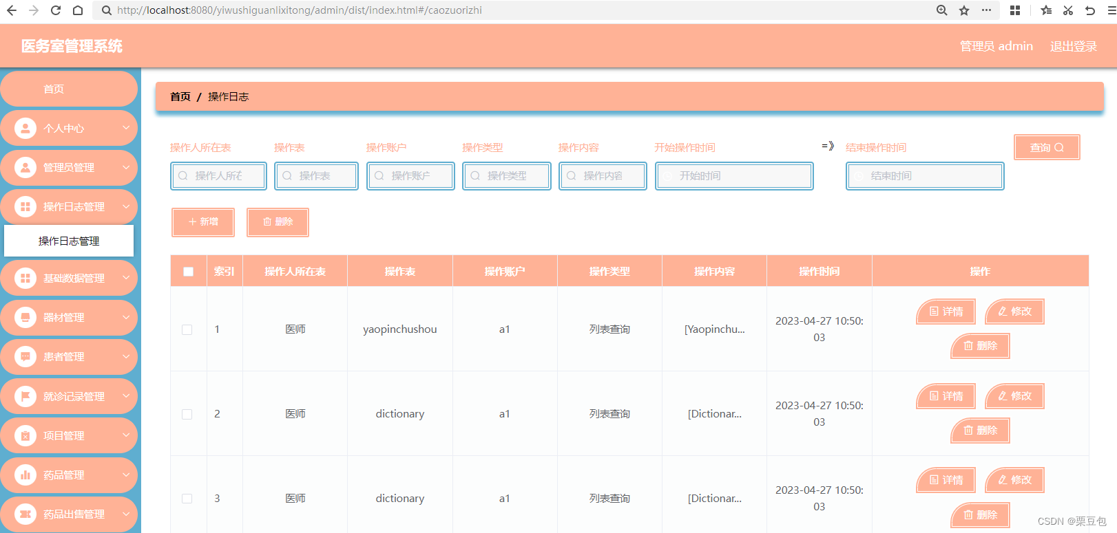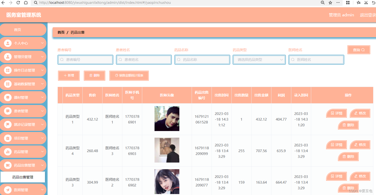 医务室管理系统采用当前最流行的IDEA工具进行开发,使用Java语言,框架使用Spring Boot框架。能实现操作日志管理,器材管理,器材申请管理,器材报废管理,患者管理,就诊记录管理,项目管理,药品管理,药品出售管理,医师管理等功能。