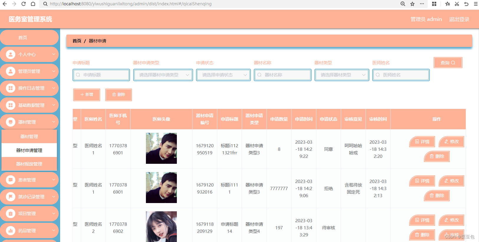 对于管理员角色,系统允许其操作所有的功能,其主要包括管理医师信息,审核器材申请信息,管理器材信息以及器材报废信息,管理患者信息,管理患者的就诊记录信息,管理项目信息,管理药品信息,管理药品出售信息等。
