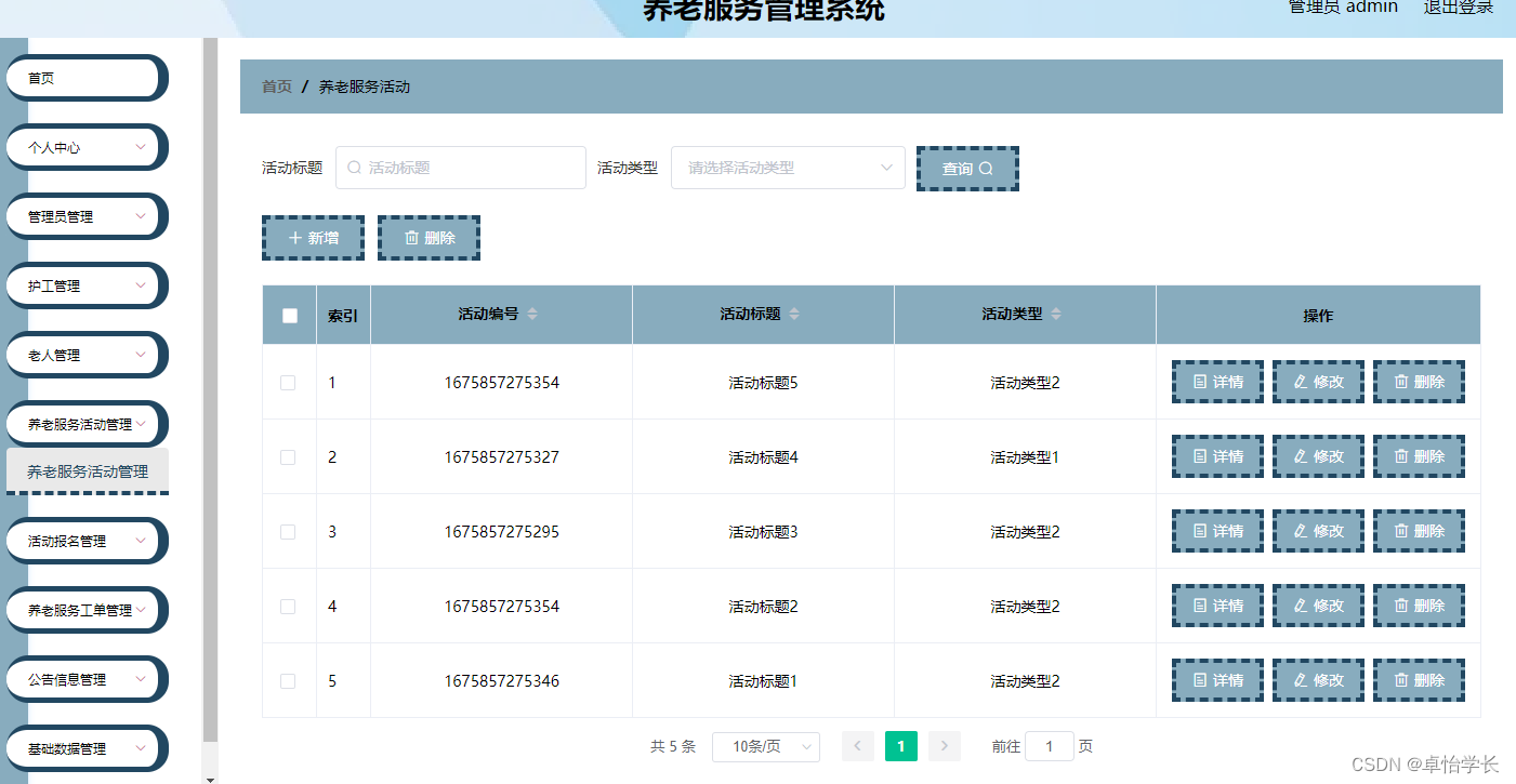 在前面分析的管理员功能的基础上,进行接下来的设计工作,最终展示设计的管理员结构图(见下图)。管理员增删改查养老服务活动