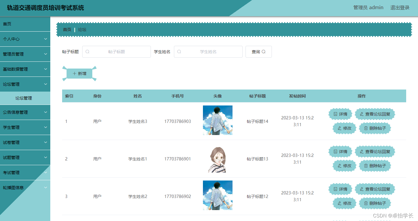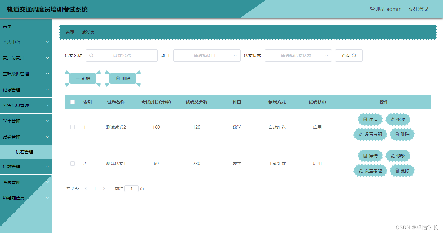 该轨道交通调度员培训考试系统主要为管理员和用户两类用户角色提供需求,管理员在后台可以对系统进行全面管理,用户在前台可以进行查看系统信息,注册登录,查询校园失物,评论,下载校园失物等操作。
