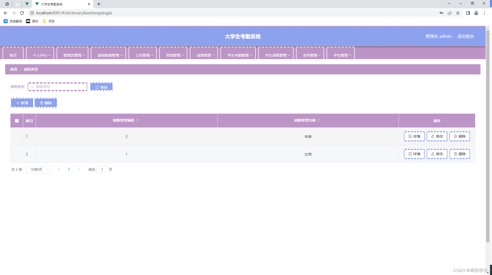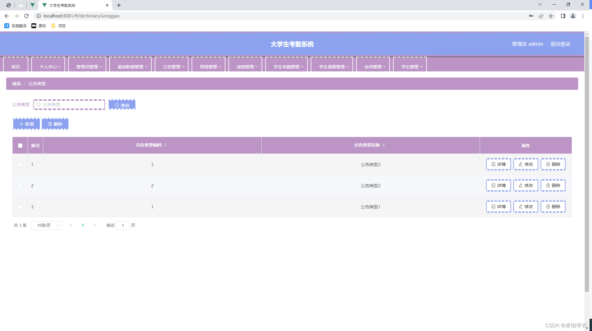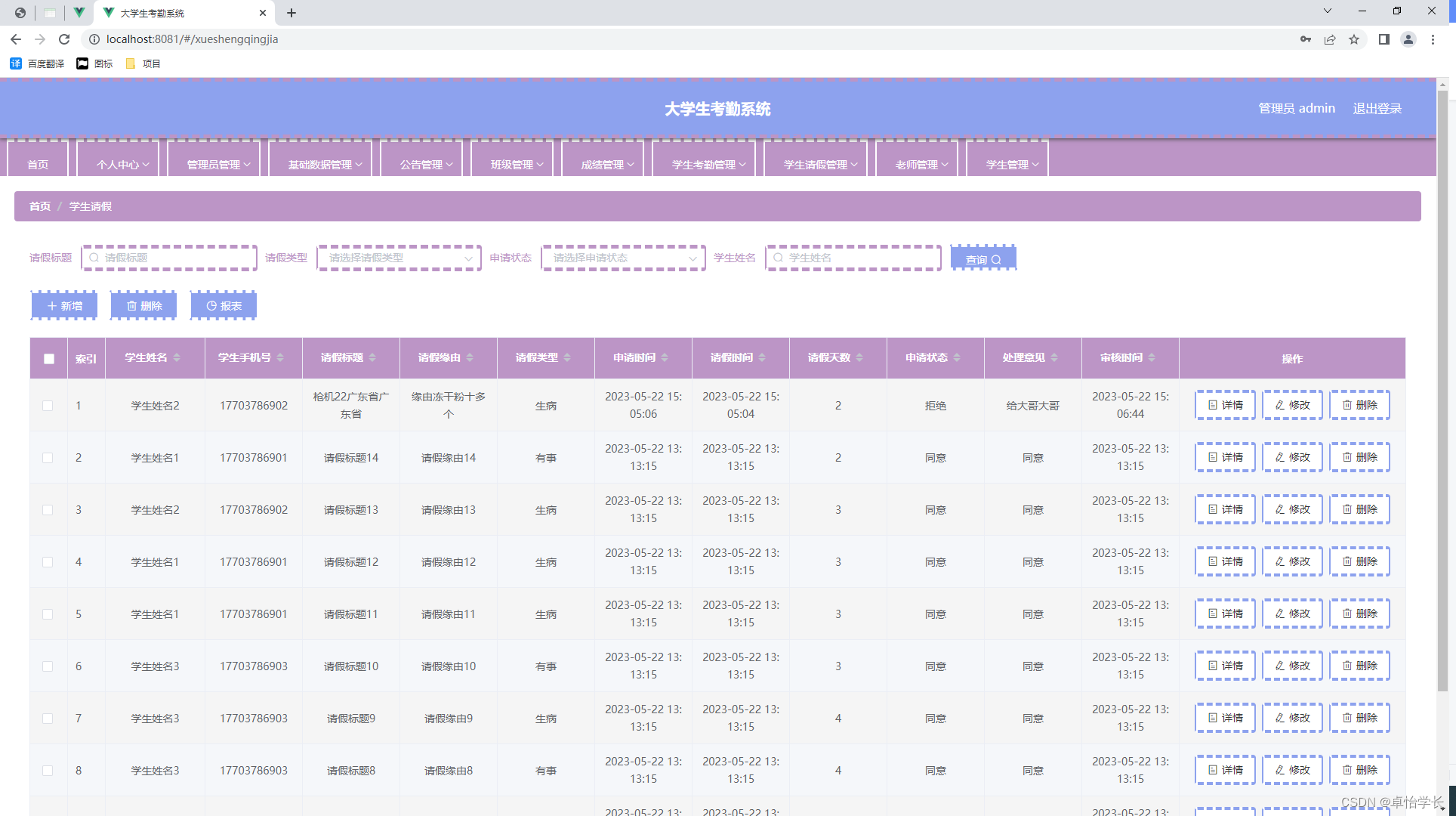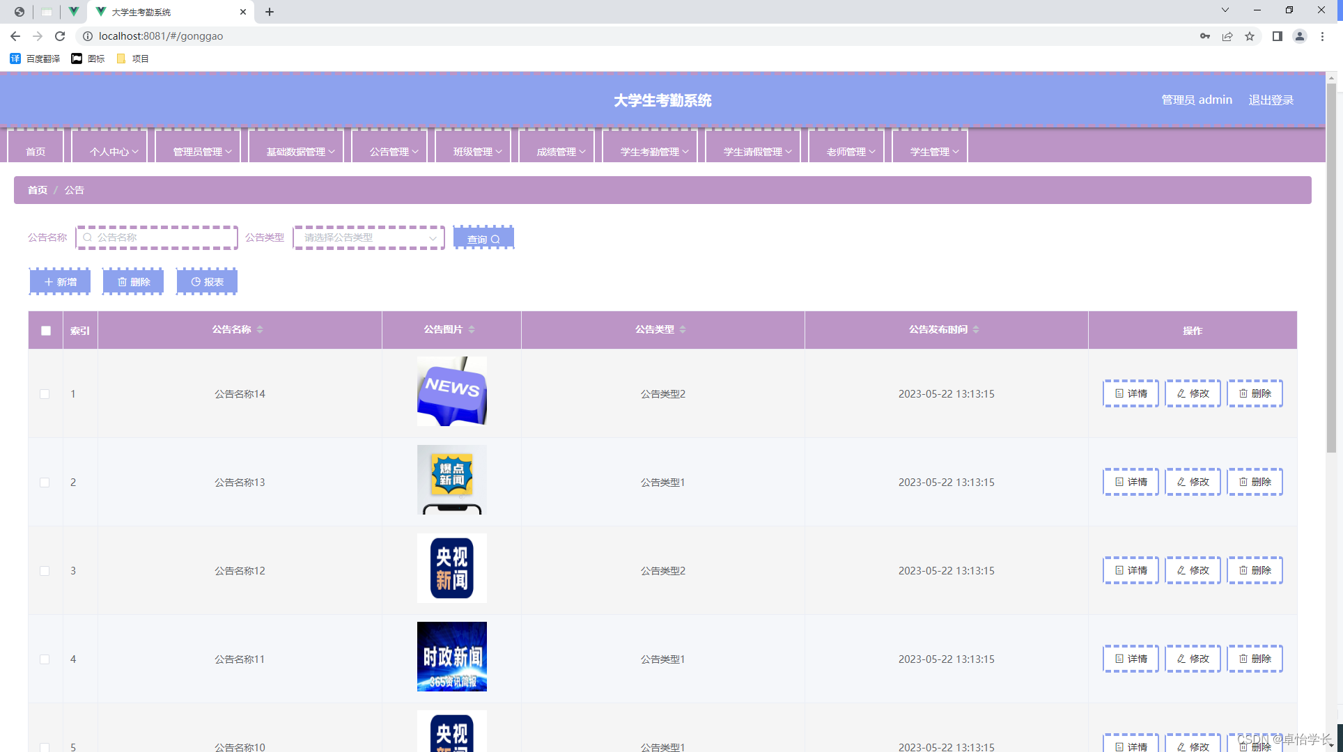 信息数据从传统到当代,是一直在变革当中,突如其来的互联网让传统的信息管理看到了革命性的曙光,因为传统信息管理从时效性,还是安全性,还是可操作性等各个方面来讲,遇到了互联网时代才发现能补上自古以来的短板,有效的提升管理的效率和业务水平。传统的管理模式,时间越久管理的内容越多,也需要更多的人来对数据进行整理,并且数据的汇总查询方面效率也是极其的低下,并且数据安全方面永远不会保证安全性能。结合数据内容管理的种种缺点,在互联网时代都可以得到有效的补充。结合先进的互联网技术,开发符合需求的软件,让数据内容管理不管是从录入的及时性,查看的及时性还是汇总分析的及时性,都能让正确率达到最高,管理更加的科学和便捷。本次开发的大学生考勤系统实现了班级管理、成绩管理、字典管理、公告管理、老师管理、学生管理、学生考勤管理、学生考勤详情管理、学生请假管理、管理员管理等功能。系统用到了关系型数据库中王者MySql作为系统的数据库,有效的对数据进行安全的存储,有效的备份,对数据可靠性方面得到了保证。并且程序也具备程序需求的所有功能,使得操作性还是安全性都大大提高,让大学生考勤系统更能从理念走到现实,确确实实的让人们提升信息处理效率。
