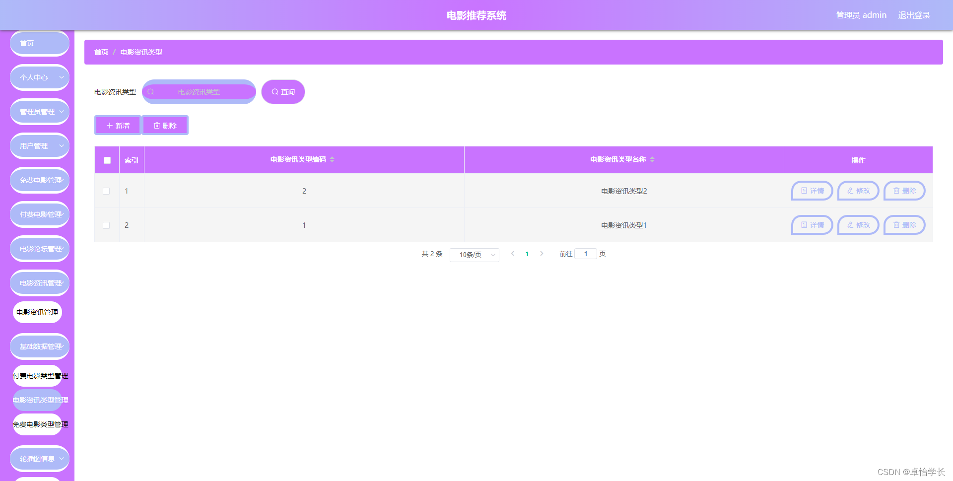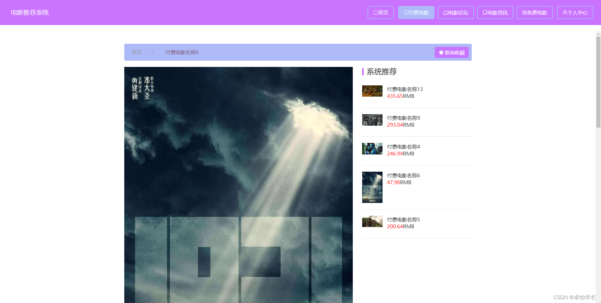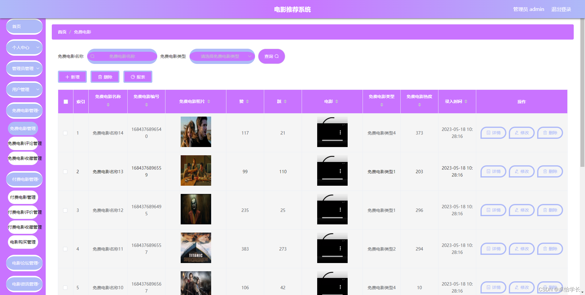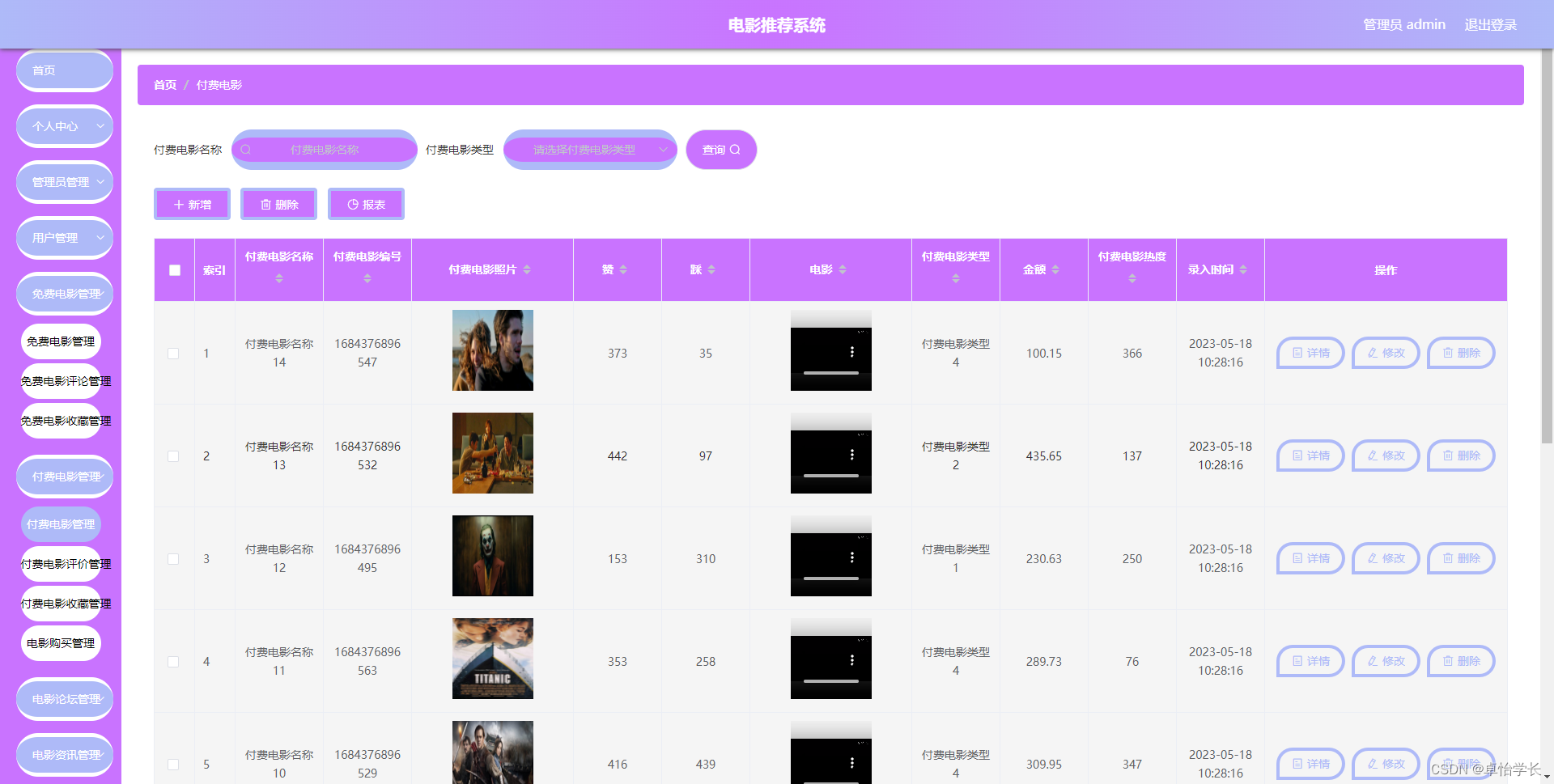 电影推荐系统管理系统按照操作主体分为管理员和用户。管理员的功能包括付费电影管理、付费电影收藏管理、付费电影评价管理、电影购买管理、字典管理、电影论坛管理、电影资讯管理、免费电影管理、免费电影收藏管理、免费电影评论管理、用户管理、管理员管理。用户的功能等。该系统采用了Mysql数据库,Java语言,Spring Boot框架等技术进行编程实现。