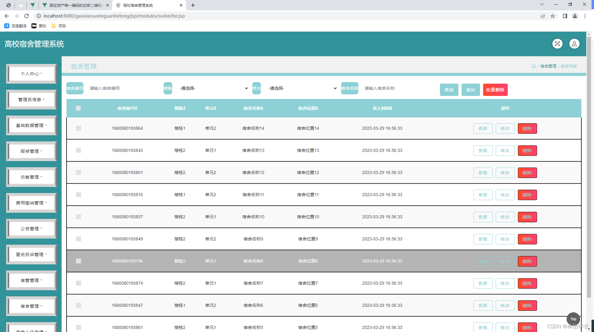 信息数据从传统到当代,是一直在变革当中,突如其来的互联网让传统的信息管理看到了革命性的曙光,因为传统信息管理从时效性,还是安全性,还是可操作性等各个方面来讲,遇到了互联网时代才发现能补上自古以来的短板,有效的提升管理的效率和业务水平。传统的管理模式,时间越久管理的内容越多,也需要更多的人来对数据进行整理,并且数据的汇总查询方面效率也是极其的低下,并且数据安全方面永远不会保证安全性能。结合数据内容管理的种种缺点,在互联网时代都可以得到有效的补充。结合先进的互联网技术,开发符合需求的软件,让数据内容管理不管是从录入的及时性,查看的及时性还是汇总分析的及时性,都能让正确率达到最高,管理更加的科学和便捷。本次开发的高校宿舍管理系统实现了报修,访客,公告,费用缴纳,宿舍,宿管,宿舍入住等功能。系统用到了关系型数据库中王者MySql作为系统的数据库,有效的对数据进行安全的存储,有效的备份,对数据可靠性方面得到了保证。并且程序也具备程序需求的所有功能,使得操作性还是安全性都大大提高,让高校宿舍管理系统更能从理念走到现实,确确实实的让人们提升信息处理效率。