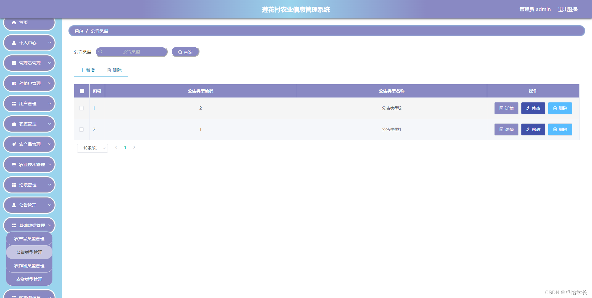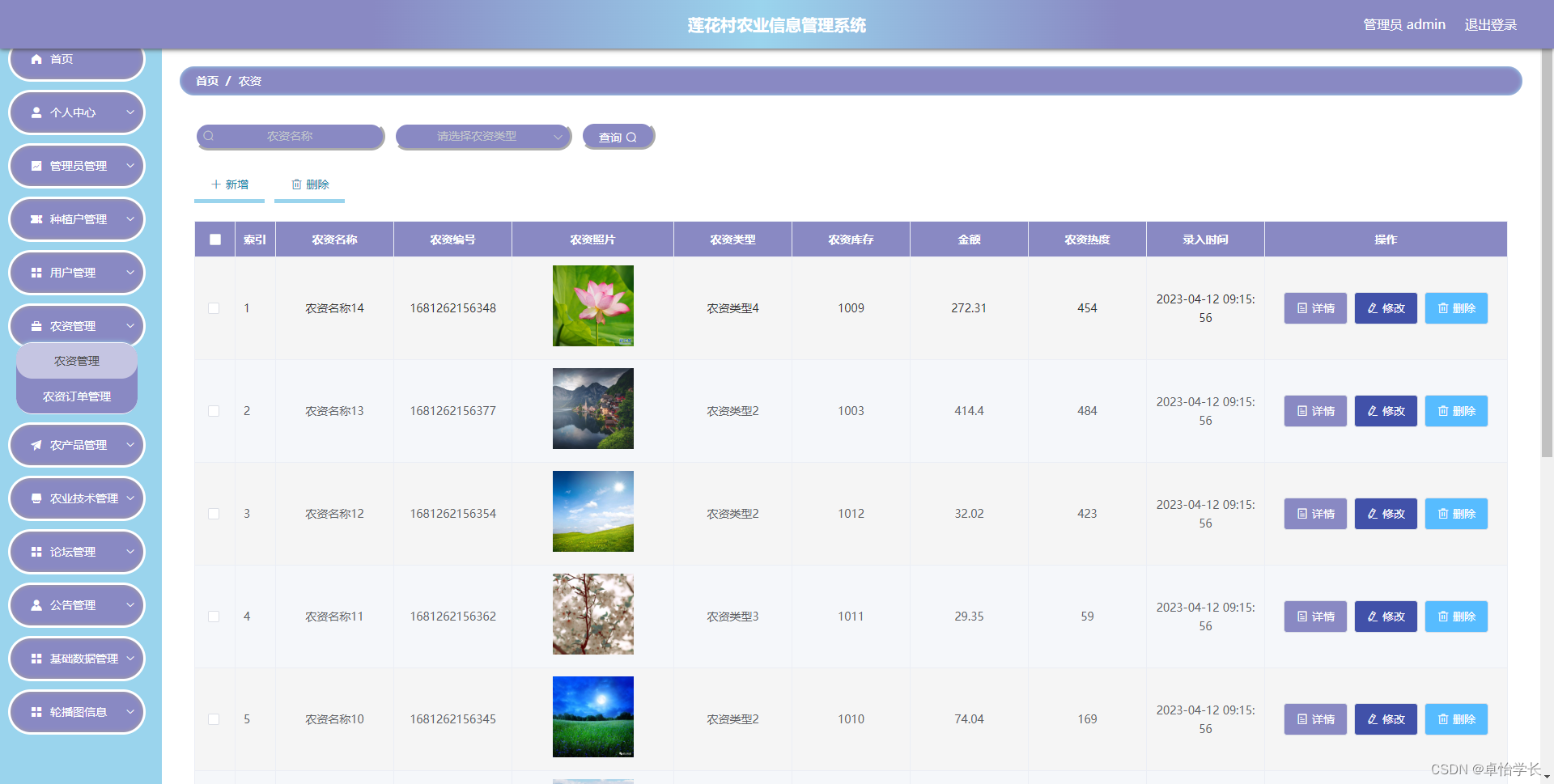 莲花村农业信息管理系统管理系统按照操作主体分为管理员和用户。管理员的功能包括收货地址管理、购物车管理、农产品管理、农产品收藏管理、农产品评价管理、农产品订单管理、字典管理、论坛管理、公告管理、农业技术管理、农资管理、农资订单管理、用户管理、种植户管理、管理员管理。用户的功能等。该系统采用了Mysql数据库,Java语言,SSm框架等技术进行编程实现。
