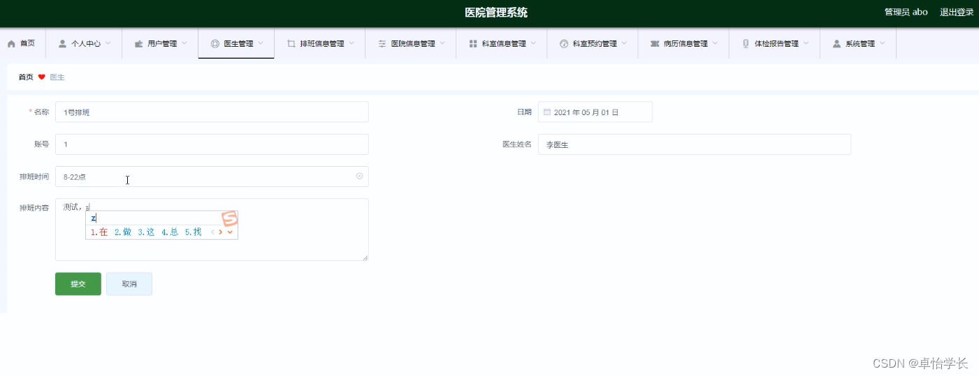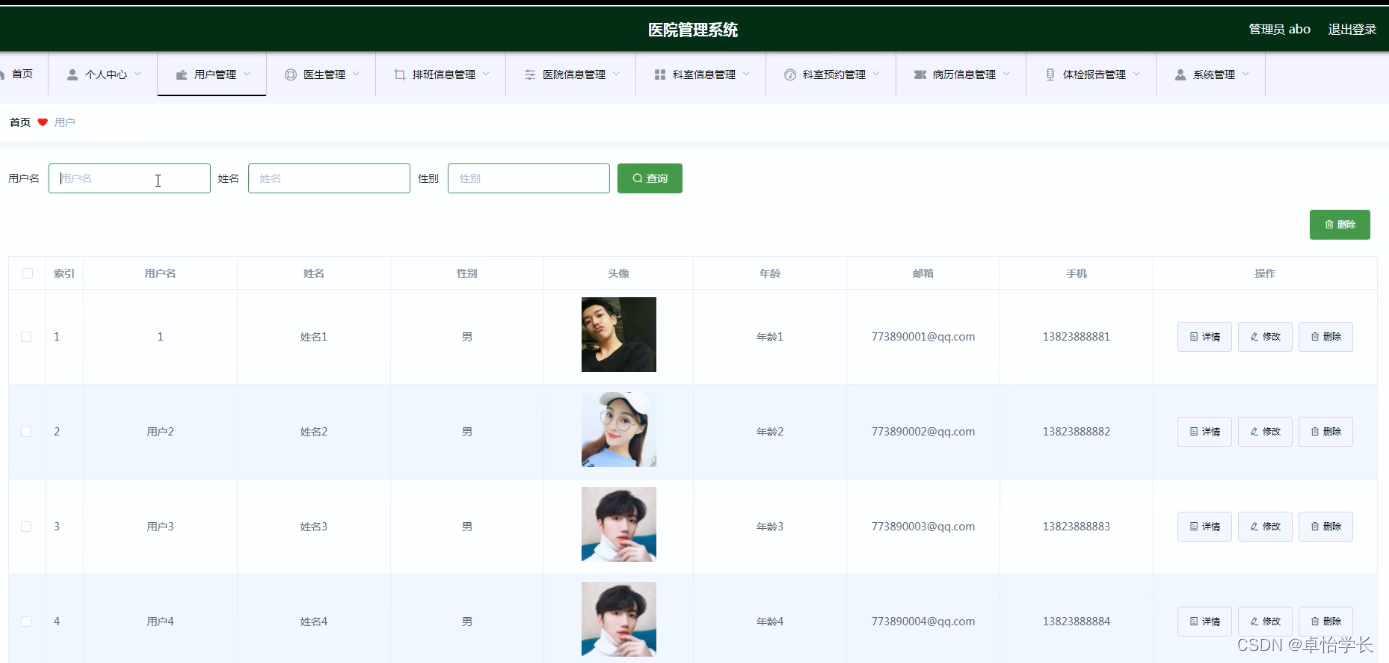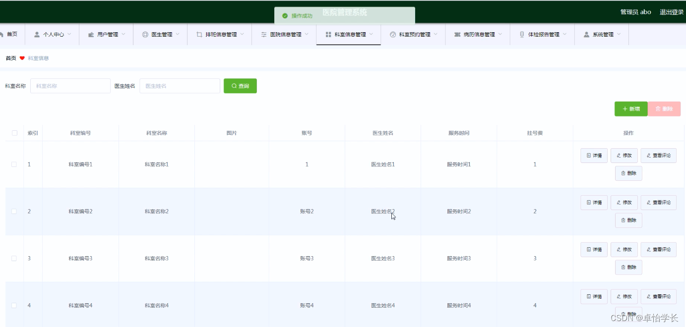 本医院管理系统小程序管理员功能有个人中心,用户管理,医生管理,排班信息管理,医生信息管理,科室信息管理,科室预约管理,病历信息管理,体检报告管理,系统管理等。医生可以进行管理,排班,处理预约信息,体检信息,病历信息等。用户可以注册登录,进行预约等。因而具有一定的实用性。
