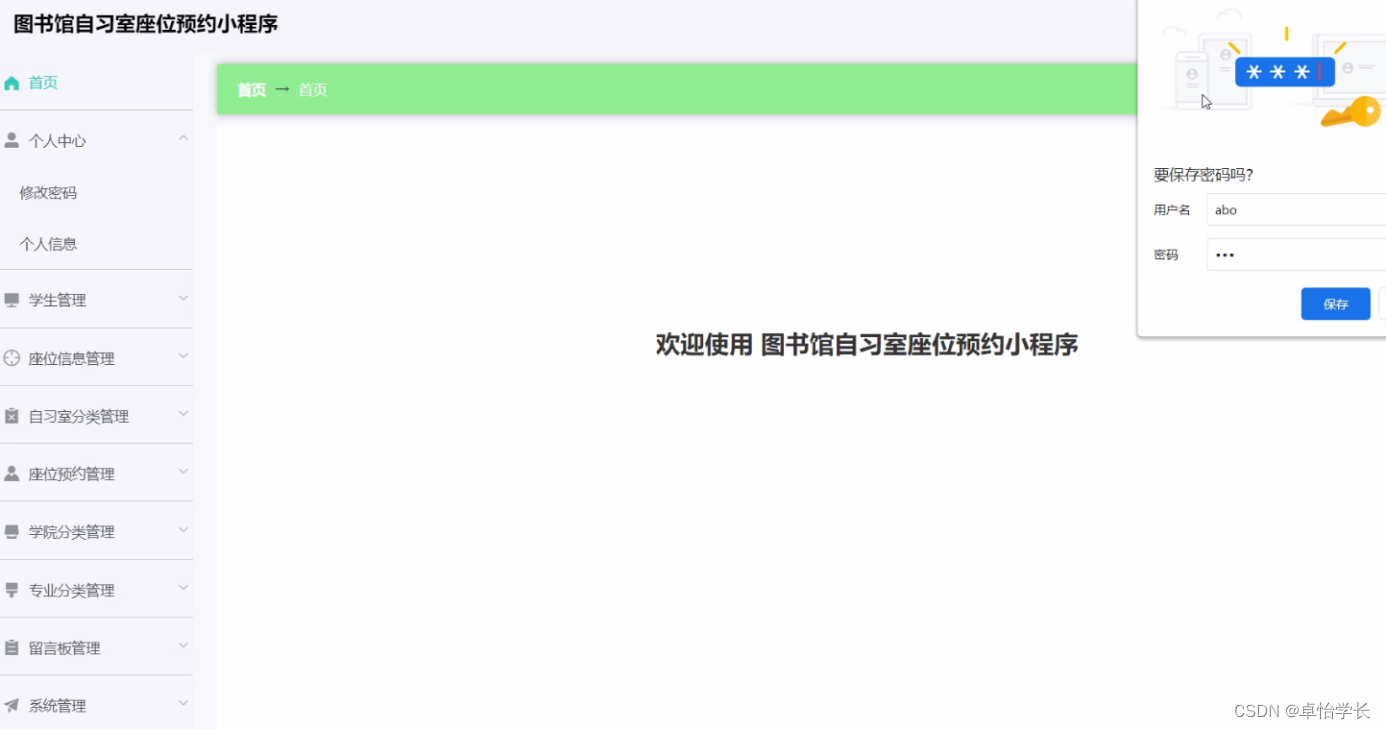 管理员权限主要实现了管理员服务端;首页、个人中心、学生管理、座位信息管理、自习室分类管理、座位预约管理、学院分类管理、专业分类管理、留言板管理、系统管理,学生微信端;首页、座位信息、座位预约、我的等功能,基本上实现了整个图书馆自习室座位预约小程序信息管理的过程。本系统在一般图书馆自习室座位预约的基础上增加了最新信息的功能方便学生快速浏览,是一个高效的、动态的、相互友好的图书馆自习室座位预约小程序。