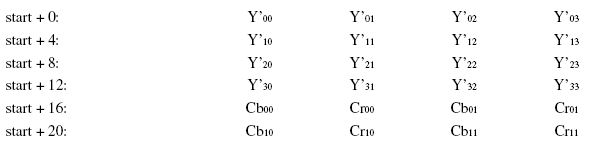 下面我用图的形式给出常见的YUV码流的存储方式,并在存储方式后面附有取样每个像素点的YUV数据的方法,其中,Cb、Cr的含义等同于U、V。