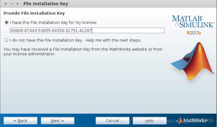 网盘中我已经把Matlab 2017a Linux64 Crack.rar解压,把R2017目录里的libmwservices.so文件copy到镜像所在目录下。我的镜像目录是home/down/MATLAB