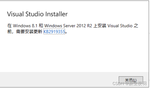 win server 2012 R2环境下安装 软件时候提示需要更新KB2919355 笔者此次在安装visual studio2019时出现的此提示,搜索发现其他人有在安装VMware时弹出此提示。这可能该版本系统下产生的通用问题。弹出的提示语如下处理方法如下:如果只安装提示的KB2919355是会安装失败的,这是因为Windows Server 2012 R2缺少两个更新补丁。安装包示图如上。