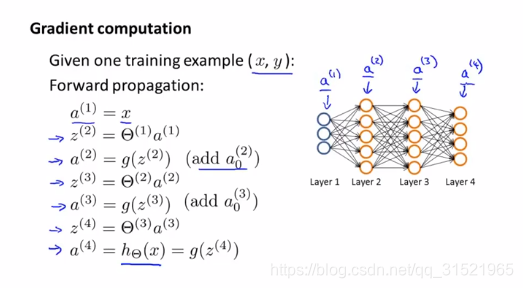 我们在上面定义,如同右上角所设置的一样,我们用L来表示总层数,sl表示对应的层数的神经元的个数。如上图中左上角所示,我们得知s1=3,s2=s3=5,s4= 4,同时它的输出只有1或者0(一个典型的分类问题)。