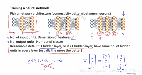 我们要训练神经网络,第一步就是选择一种网络架构。那如何选择那?对于隐藏层而言,默认使用只含有一个隐藏层的网络结构。这最为常见。如果使用隐藏层不止一个,那么默认每一个隐藏层神经元的数目应当是一样的。那么隐藏层的数量是如何确定的那?一般来说隐藏层的数量默认越多越好,但隐藏层的数量越多就会导致计算量的增大。同时,每一个隐藏层包含的单元数量还应该和输入的特征的维度相一致,或者是它的二倍三倍均可。