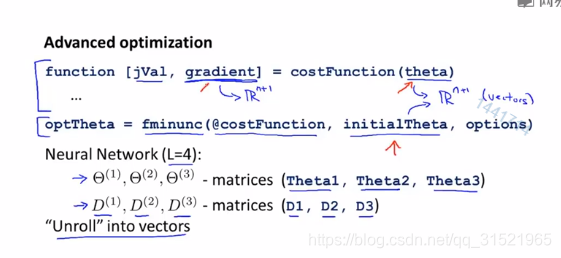 如上图所示,我们现在有一个3层的神经网络,它们对应的矩阵分别如上图所示,我们要做的就是将其变为对应的1维。如θ1是一个10*11我们将其变为1维后就变为1*110。同时我们还要保持原有的矩阵,这样无论是我们要做前向传播还是反向传播都有对应的参数。当你的参数以矩阵的形式存储时,你进行正向传播和反向传播都会更加的方便。但你还要使用一些优化算法,这些优化算法要求输入的参数为长向量的形式。