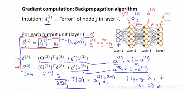 我们使用代价函数是为了求得对应的参数,但实际上我们求得过程格外复杂,我们需要对每一个参数进行求偏导,这样的话计算量会变得很大,我们提出反向传播算法帮助我们完成对每一参数的求导。具体的等式为