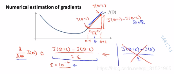 当反向传播与其他神经网络还有梯度下降或者其他复杂的算法一起工作时,总会产生这样或者那样的BUG,这些BUG并不会导致我们的程序完全错误,但会导致最终的运行结果会导致代价函数最终会比没有BUG的要高一个量级。为了检测这种情况我们提出梯度检测。这种方法很好的使得我们实现前向传播和后向传播。