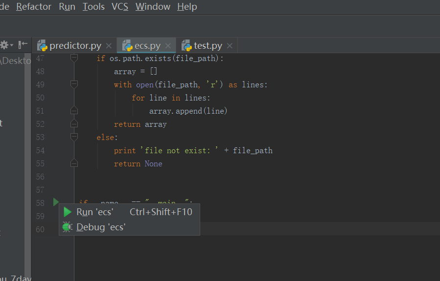 如上图,不要点击pycharm右上角的Debug,那样不能进入调试(在多个py文件都存在的情况下),找到程序的入口点出(if __name == "__main__),会有上图所示一个三角符号,点击后,出来上图两个选项,点击Debug'ecs'即可(ecs是我的.py文件名字),就进入愉快的单步调试界面啦