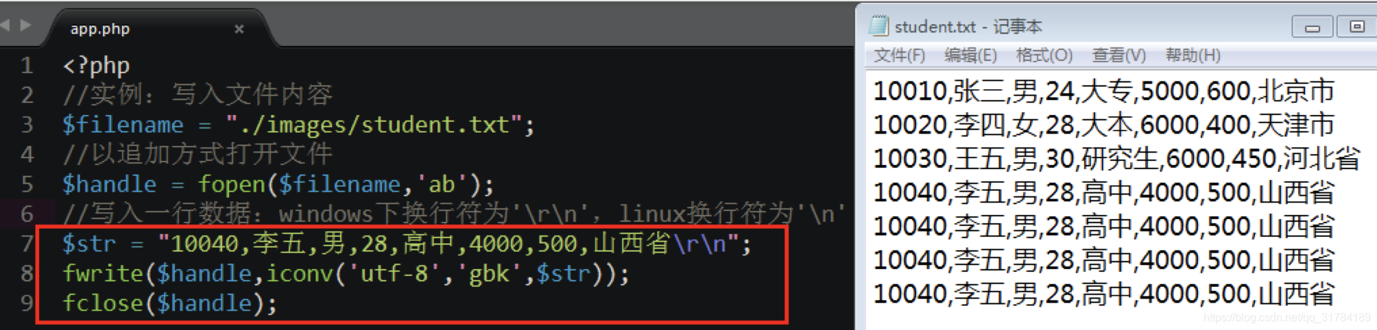 - 返回:返回写入的字符数,出现错误时则返回 FALSE 。