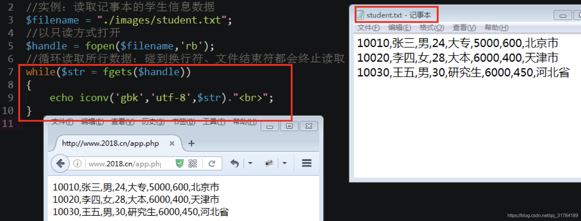 - 参数:$handle必须是由fopen()打开的文件指针。