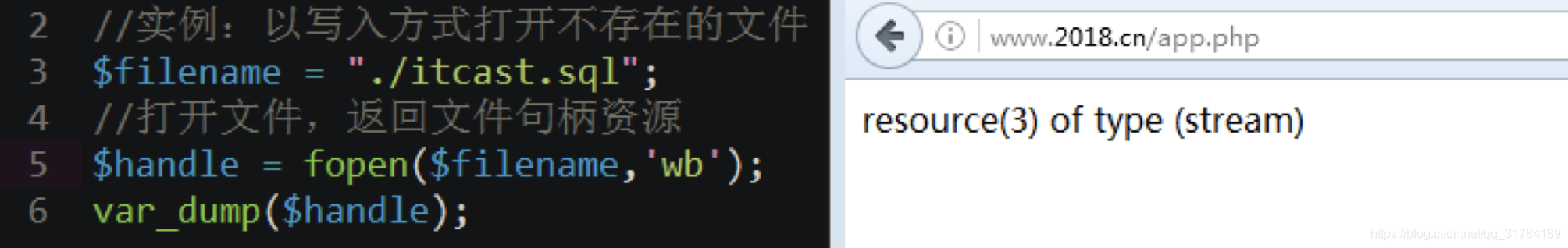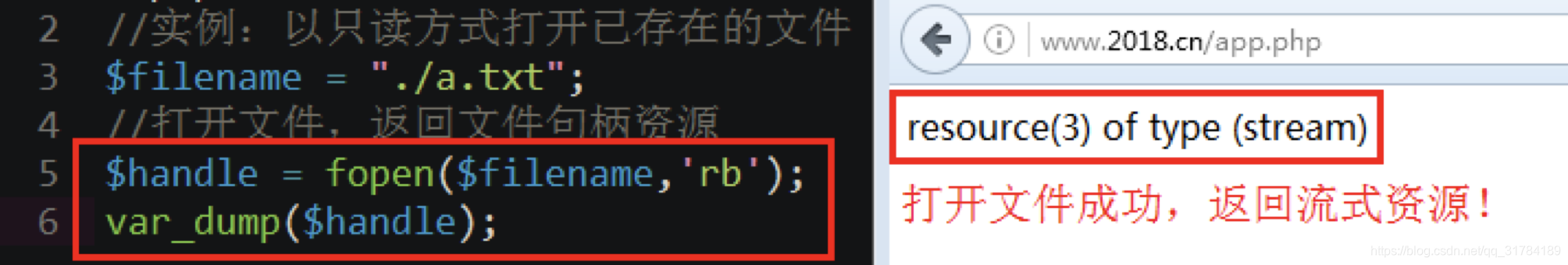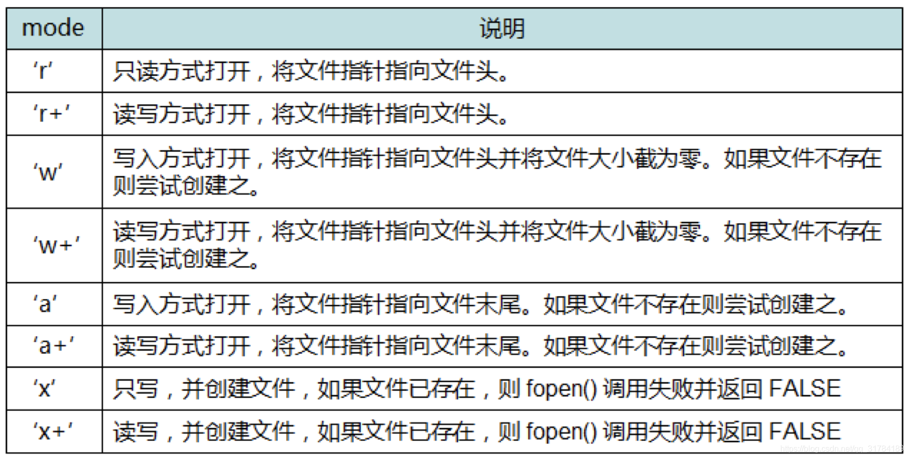 - 返回值:成功时返回文件指针资源,如果打开失败,本函数返回 FALSE。