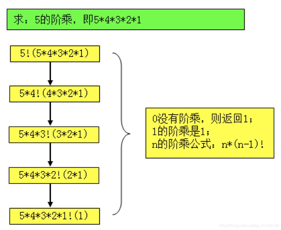 - 递归思想:把一个相对复杂的问题转化为一个与原问题相似的规模较小的问题来求解。比如:求n的阶乘n!=n*(n-1)!。
