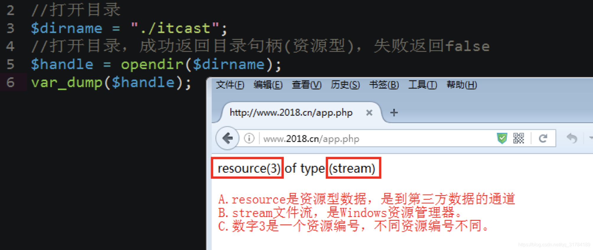 - 返回值:如果成功则返回目录句柄的 resource,失败则返回 FALSE。