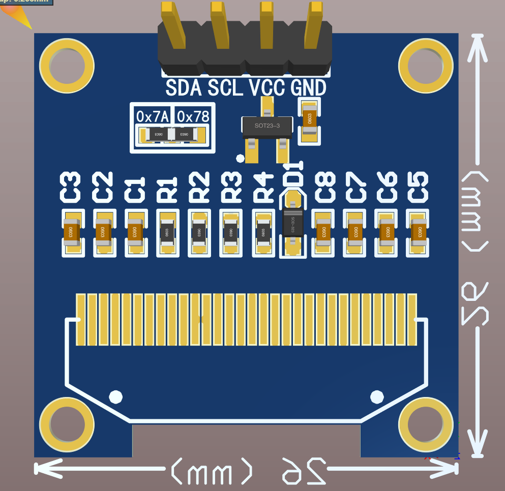 0.96寸OLED屏硬件驱动电路 0.96寸OLED屏硬件驱动电路因为自己要做一个小体积的控制电路需要用到OLED显示屏,但是传统的四针IIC通信的OLED屏体积太大,所以就想着把集成SSD1315的0.96OLED屏浓缩到电路上。传统的四针IIC通信OLED屏幕如下:所以想着把驱动电路放到自己的PCB上,看了很多参考电路,最终的电路如下(7脚悬空不接):但是板子收到后,无论怎么调试都不管用,屏幕测试点不亮,但是放在标准的OLED模块上显示却正常,说明是电路问题,屏幕没问题。查了很多资料,官方的datasheet里的电路也是这个.