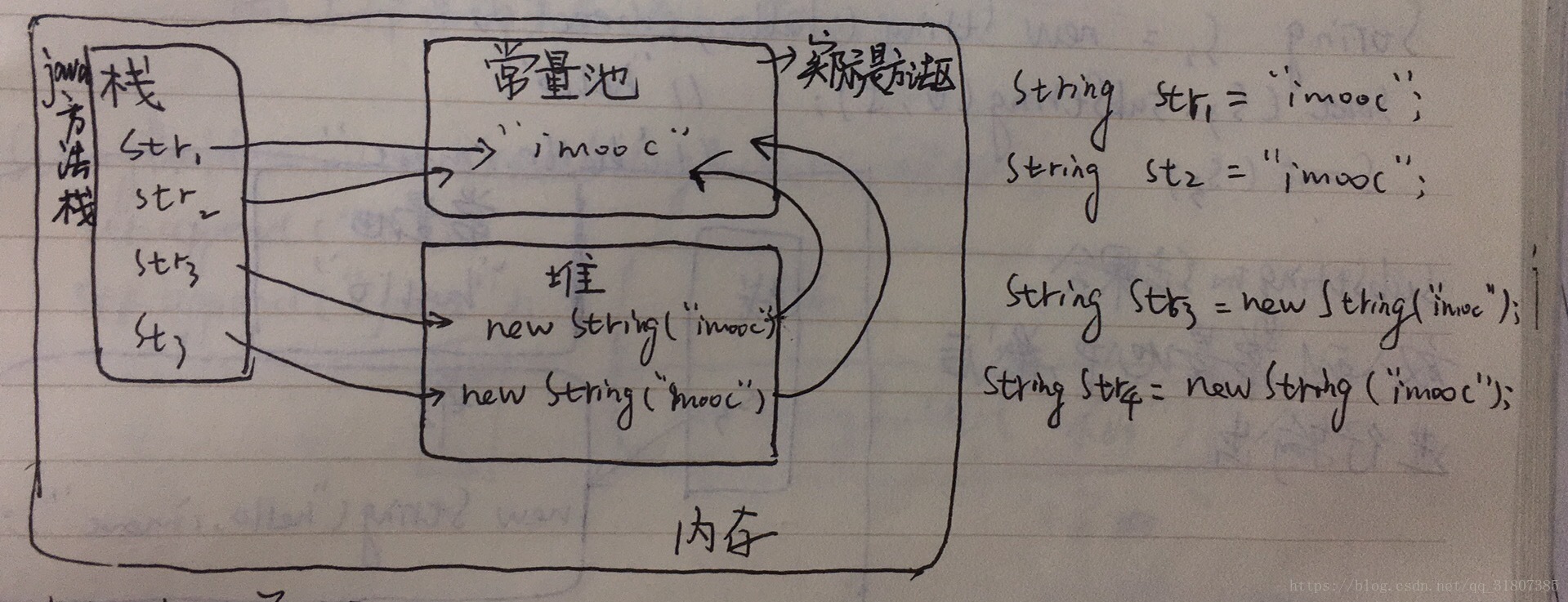 str1引用在栈中,指向了堆中的对象,str2引用在栈中指向常量池(方法区),两者的地址是不一样的。 请注意:字符串常量中的字符串也是对象,堆中的字符串对象都是指向了字符串常量池中的对象的。
