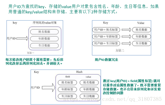 | Hash | 散列 | 存储用户信息:key(用户ID) + field(属性标签) 操作对应属性数据了,既不需要重复存储数据,也不会带来序列化和并发修改控制的问题。很好的解决了问题 |
