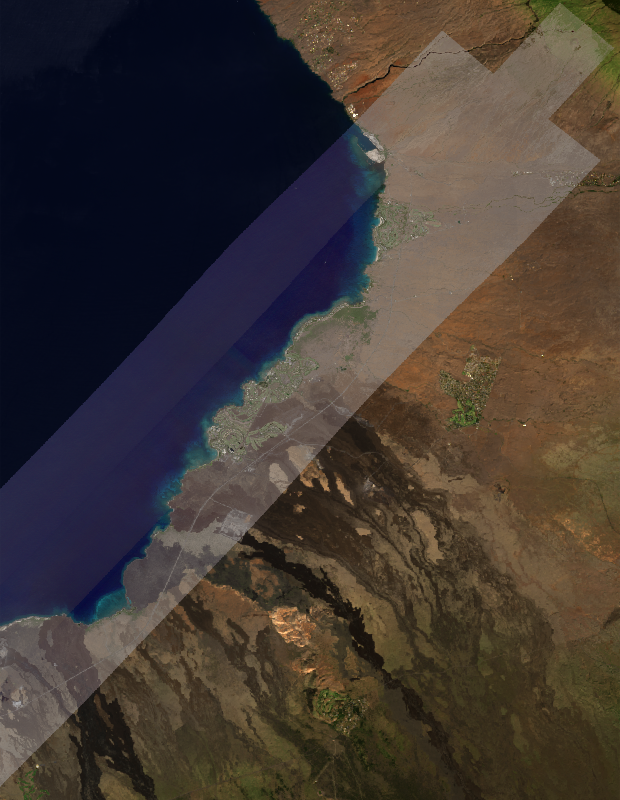 为了说明这是什么样子以及它是如何工作的,我将把高分辨率(0.8m/像素)SkySat 图像与大约在同一时间拍摄的 Landsat 8 校准表面反射率图像进行直方图匹配。下面是在匹配之前 SkySat 图像叠加在 Landsat 数据之上的情况。还显示了每个图像的直方图:
