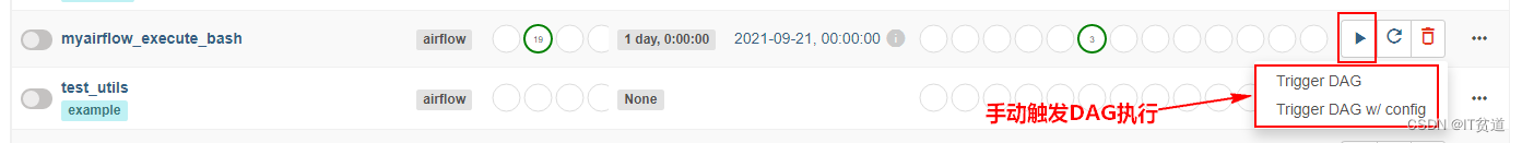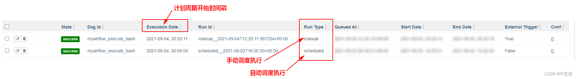 如下图,在airflow中,“execution_date”不是实际运行时间,而是其计划周期的开始时间戳。例如:execution_date 是2021-09-04 00:00:00 的DAG 自动调度运行的实际时间为2021-09-05 00:00:00。当然除了自动调度外,我们还可以手动触发执行DAG执行,要判断DAG运行时计划调度(自动调度)还是手动触发,可以查看“Run Type”。