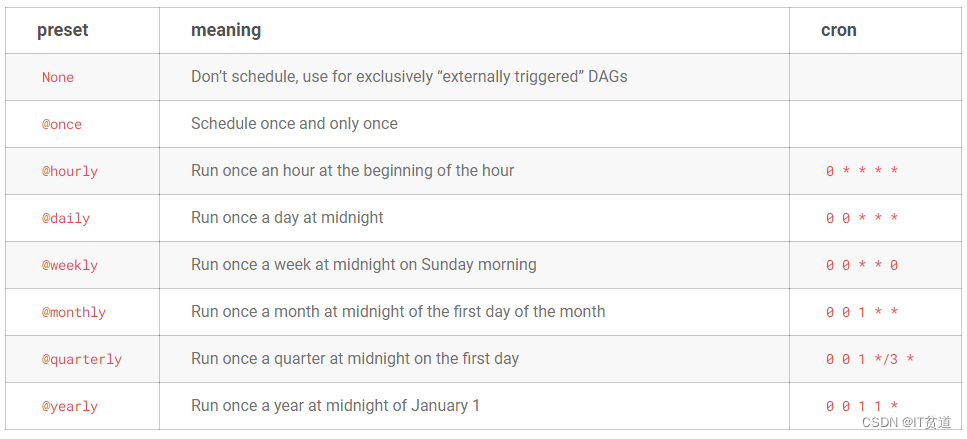 http://airflow.apache.org/docs/apache-airflow/stable/dag-run.html#cron-presets,如下图: