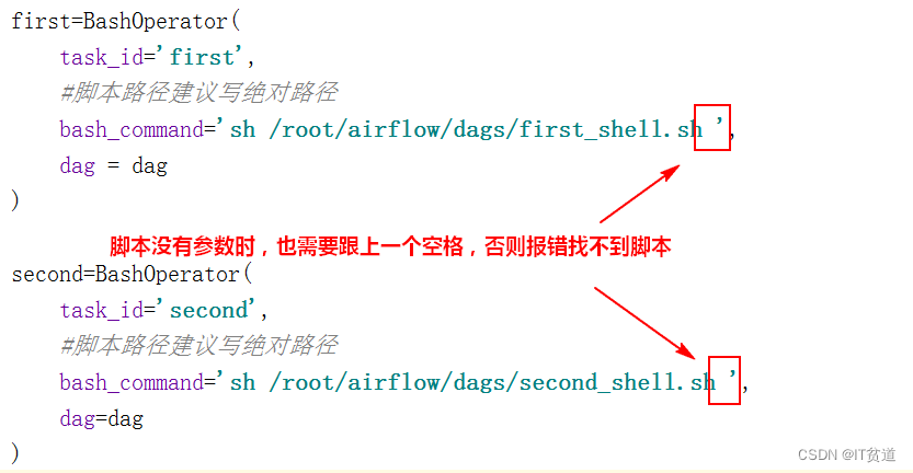 特别注意:在“bash_command”中写执行脚本时,一定要在脚本后跟上空格,有没有参数都要跟上空格,否则会找不到对应的脚本。如下: