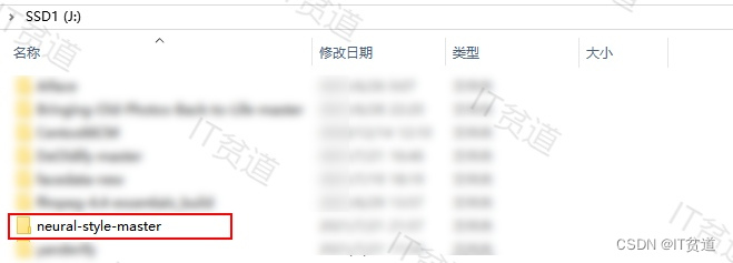 项目下载地址:https://github.com/anishathalye/neural-style,直接下载就可以,下载好的项目名字为“neural-style-master”,将下载项目解压到无中文路径中,这里放在J盘下: