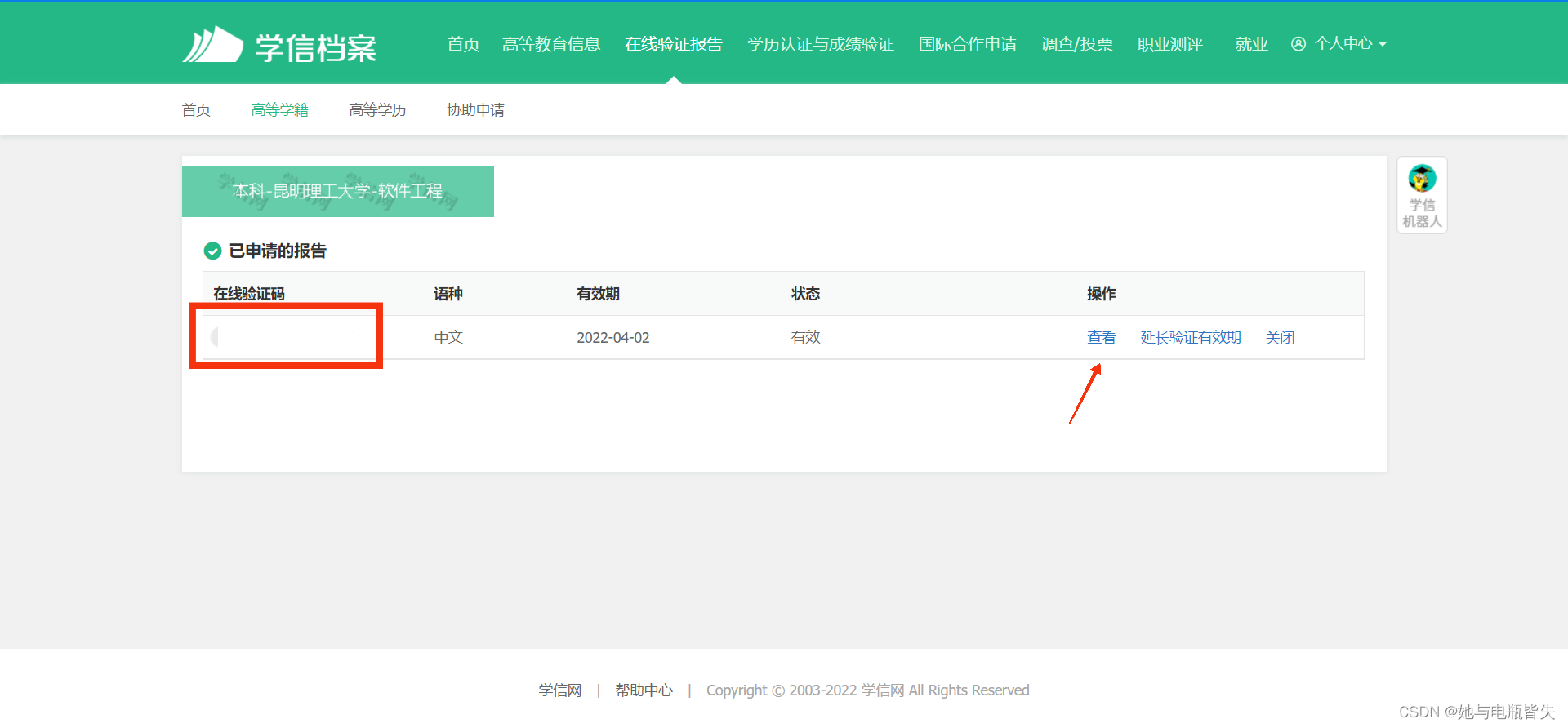 申请完成后返回上一页,点击“在线验证报告”下方的“查看”选项