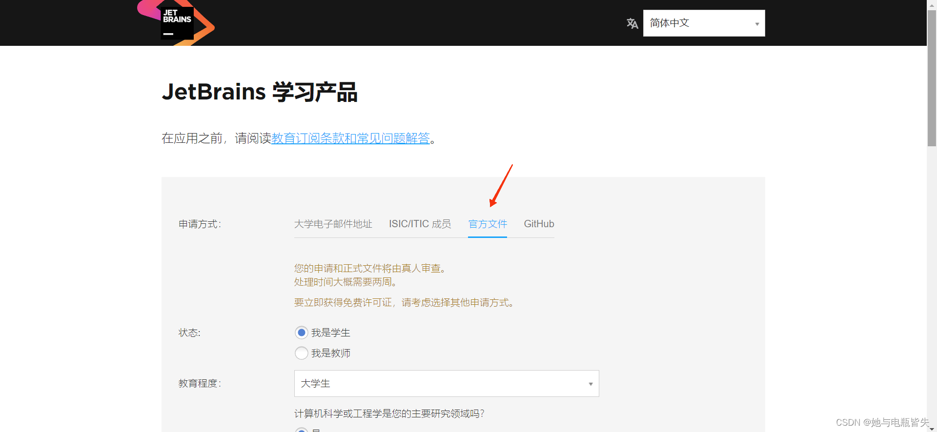 在申请页面选择“官方文件”一栏